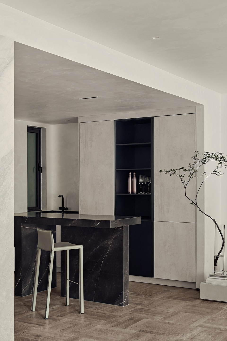 而黑色大理石吧台显出了它自然的纹理质感,厚重而高冷,背后同色系收纳格恰到好处的与之交融。 楼梯是设计的重点,贯穿了三层空间,镂空式设计暗合了开放的理念,表达出深远的意境,人行其中仿佛找到了与建筑对话的入口。
