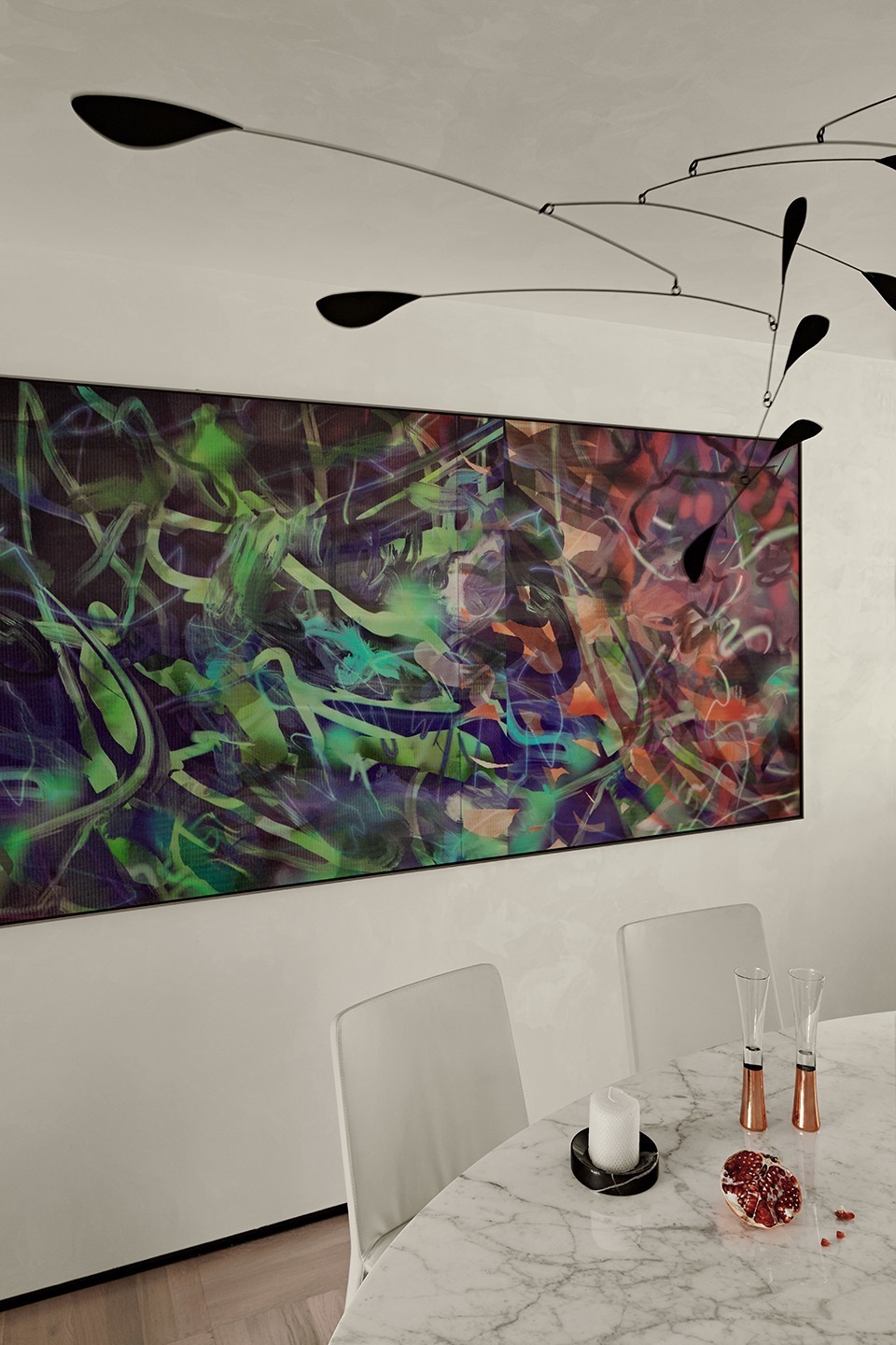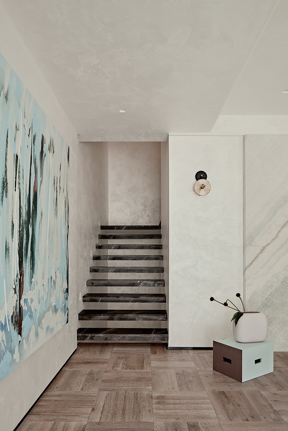 生活就是这样,女主人在亲自挑选艺术挂画的过程中,感受建筑的语言,从而决定了空间的整体情绪。