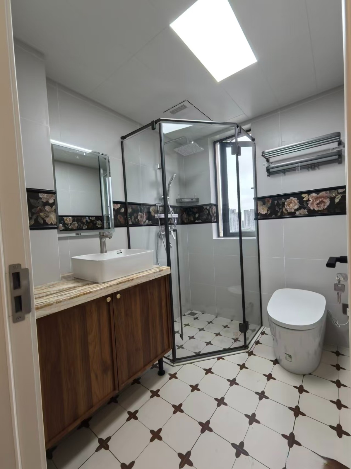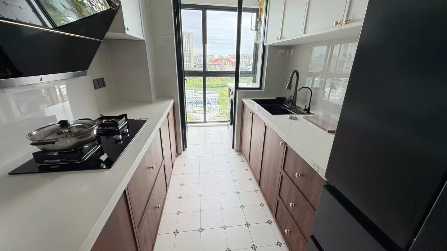 以浅白瓷砖为基底,搭配深色木纹柜,简洁干净又有温馨感