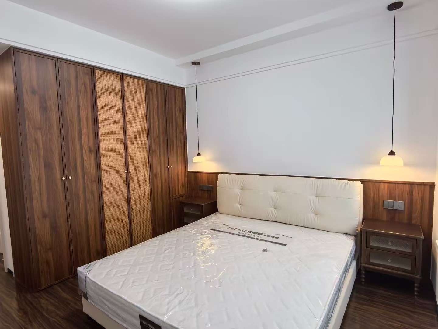 材质上结合了胡桃木纹理板材,藤编元素,软包皮革,自然质感与柔和触感兼具
