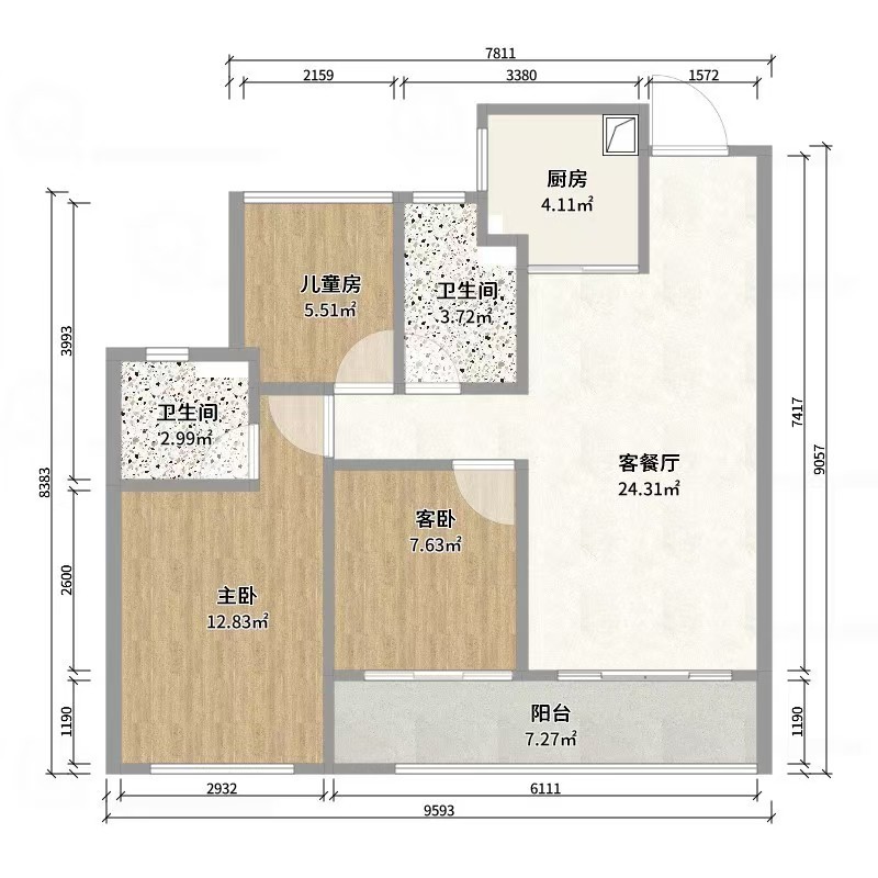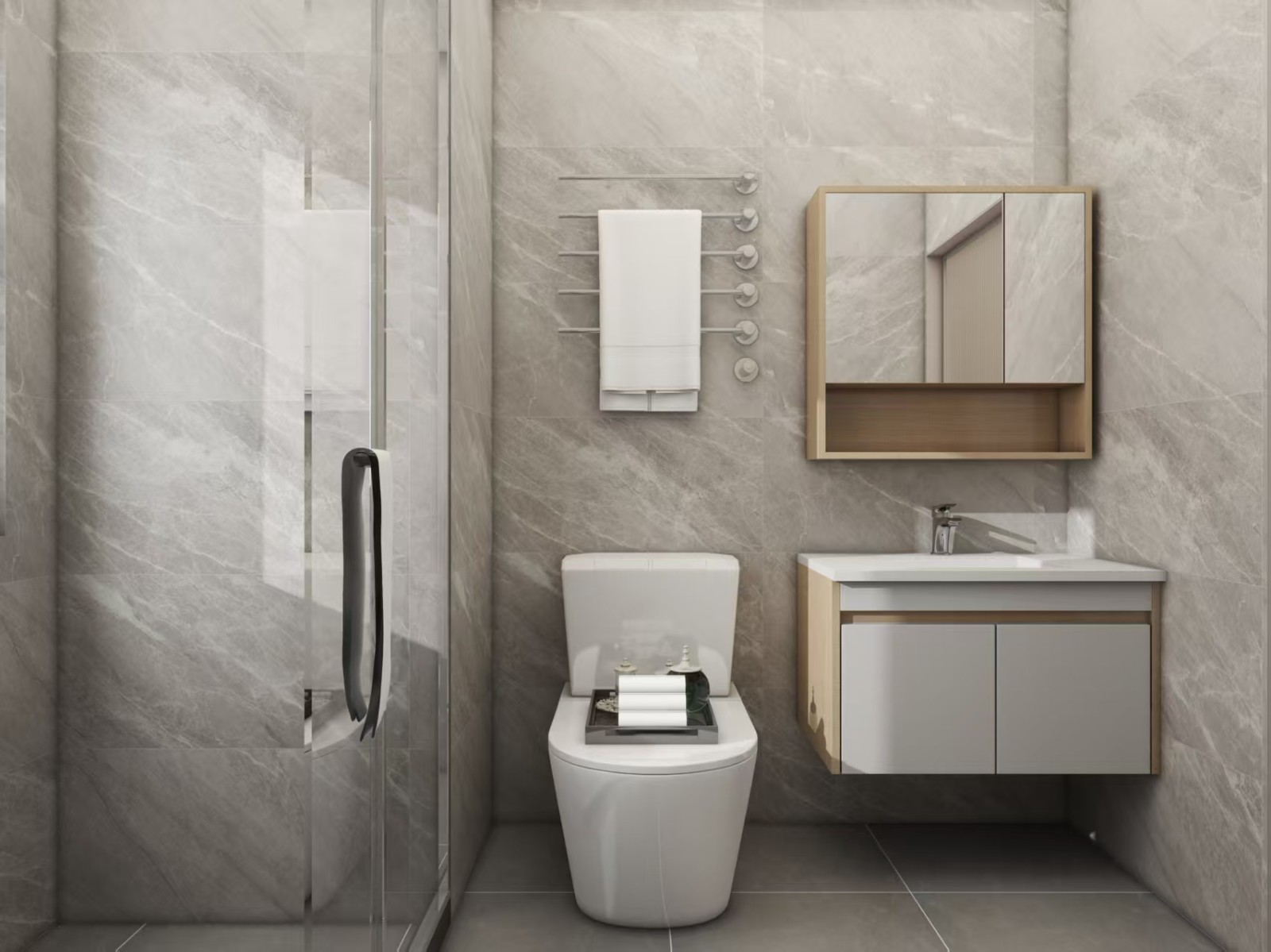 以浅灰色大理石纹理瓷砖为基底,玻璃淋浴房划分干湿区;悬空式浴室柜结合木质边框镜柜,提升收纳的同时增添温润质感,智能马桶与金属毛巾架则融入现代实用设计,小空间里实现了颜值与功能的平衡。