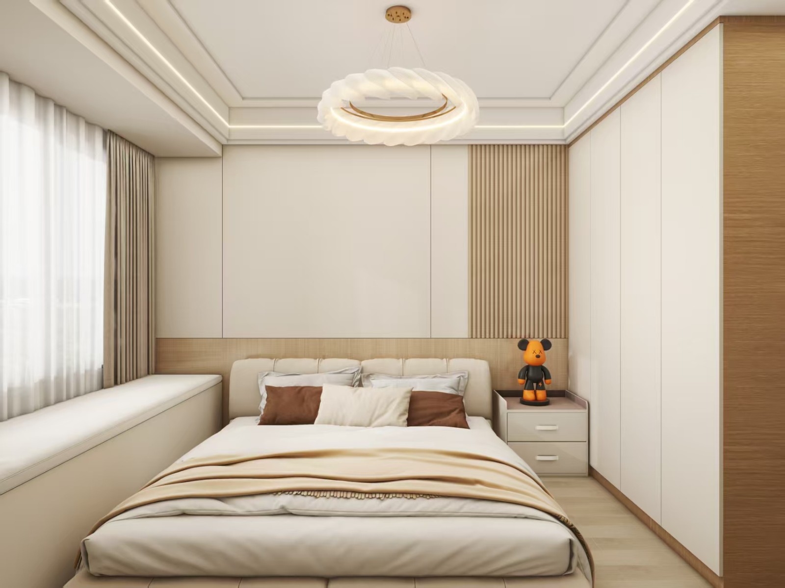 床头背景墙采用木格栅与硬包拼接设计,与定制的木色边框通顶衣柜形成材质呼应;软包床头搭配浅咖色床品,焦糖色抱枕提亮视觉,异形环形吊灯延续客厅的艺术灯款风格,飘窗定制收纳柜兼顾实用与美观,整体氛围舒适又浪漫。