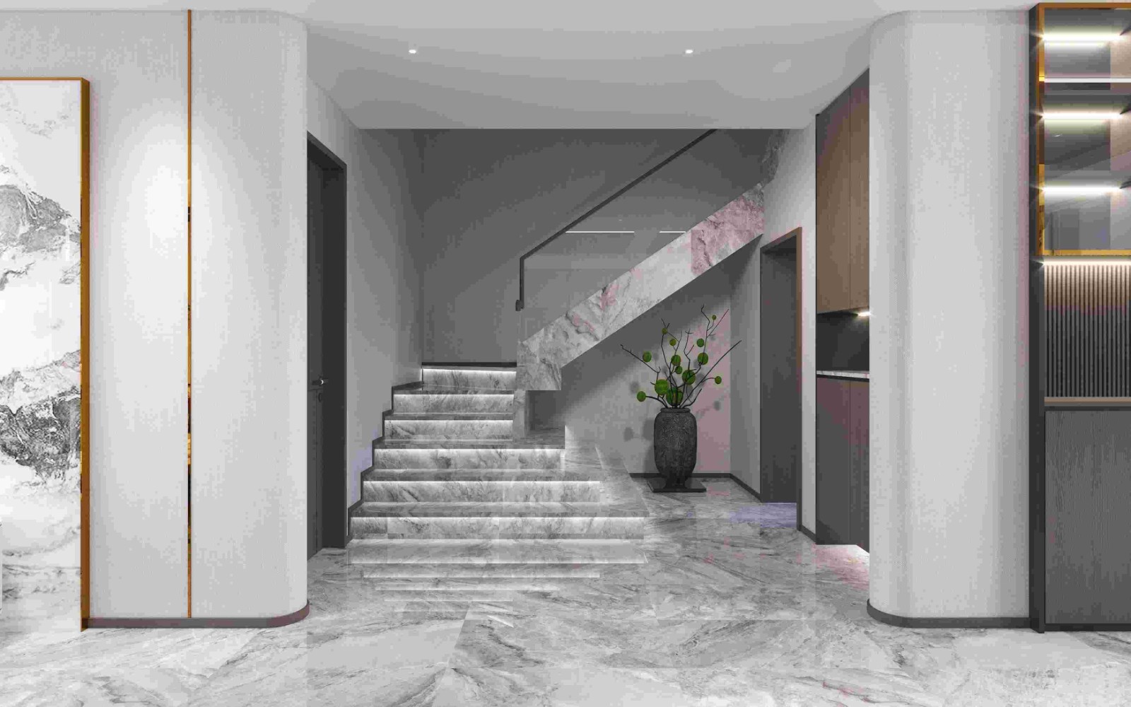 大理石搭配玻璃扶手,营造空间的通透感。