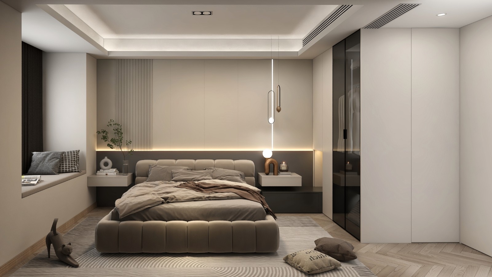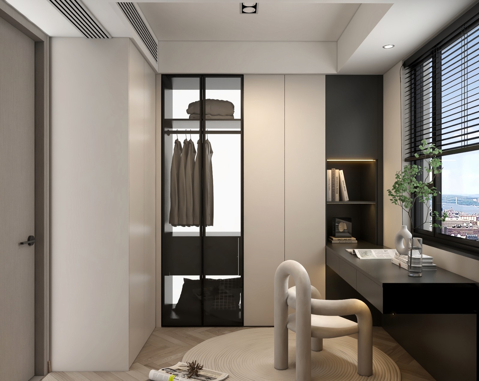 主卧背景墙也是做了点造型,衣帽间柜子也是考虑到不同的使用时间