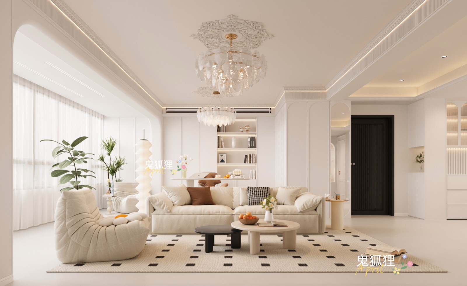 法式奶油,顶面采用虎头线,钢琴线,线形灯装修。整体配色一镜到底
