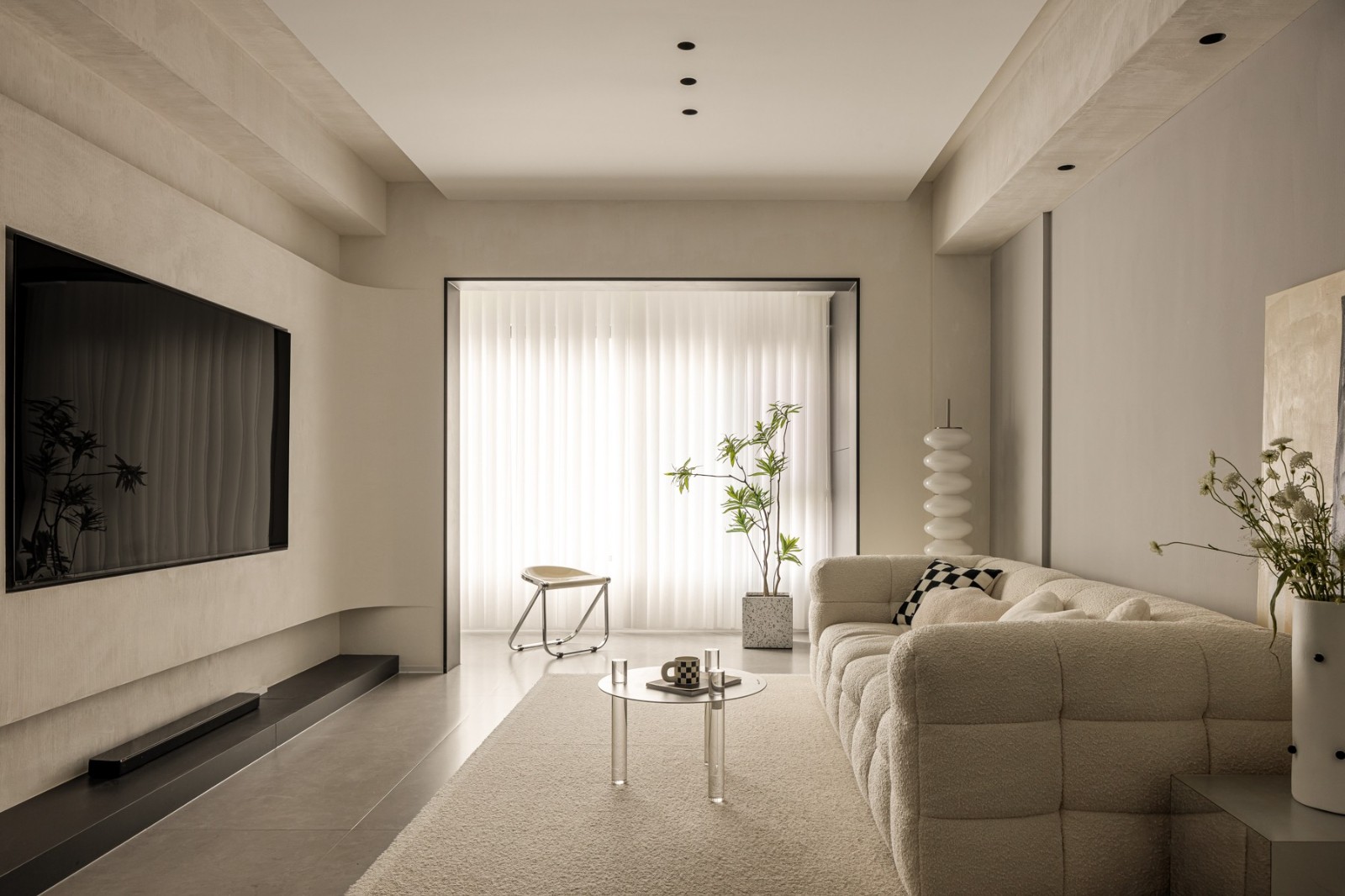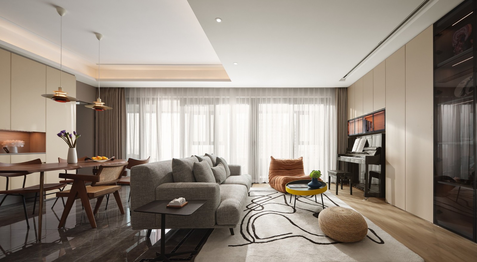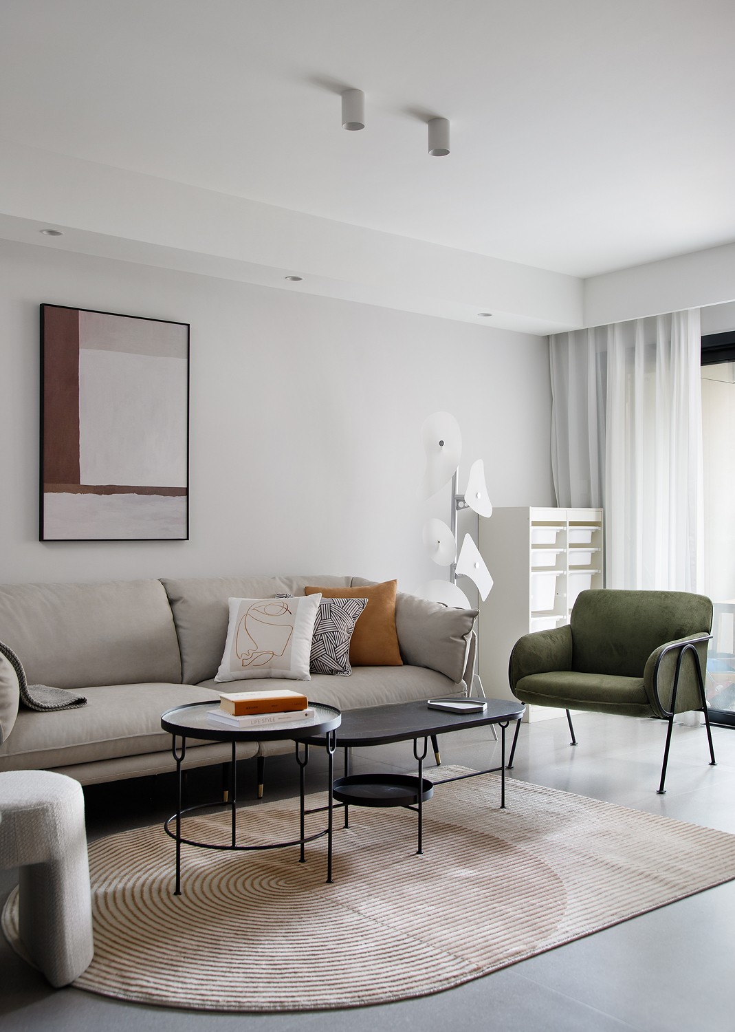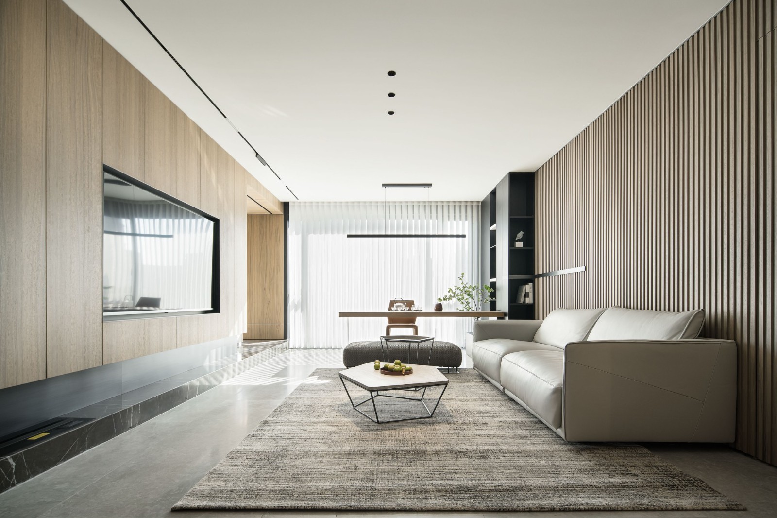 L型浅灰皮革沙发弱化体量感,弧形墙面消解直角的锐利,藤编窗门过滤强光,亚麻地毯界定核心休憩区,黑色圆形茶几以几何对比强化现代感,整体营造“围合却不压抑”的交流氛围。