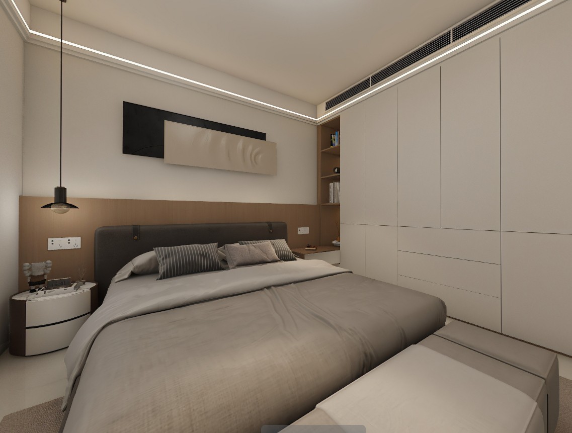 - 风格融合:整体风格偏向现代简约,同时融入了温馨的质感。以中性色调为主,搭配木质元素,营造出舒适且有格调的睡眠空间。 - 空间布局:布局规整且功能齐全,床铺占据核心位置,两侧设置床头柜满足日常置物需求,一侧的大型白色衣柜提供了充足的储物空间,角落的小型书架区域则为阅读或放置小物件提供了便利,空间利用高效且合理。 - 家具与装饰:床头设计简约大气,搭配风格统一的床品,质感十足。