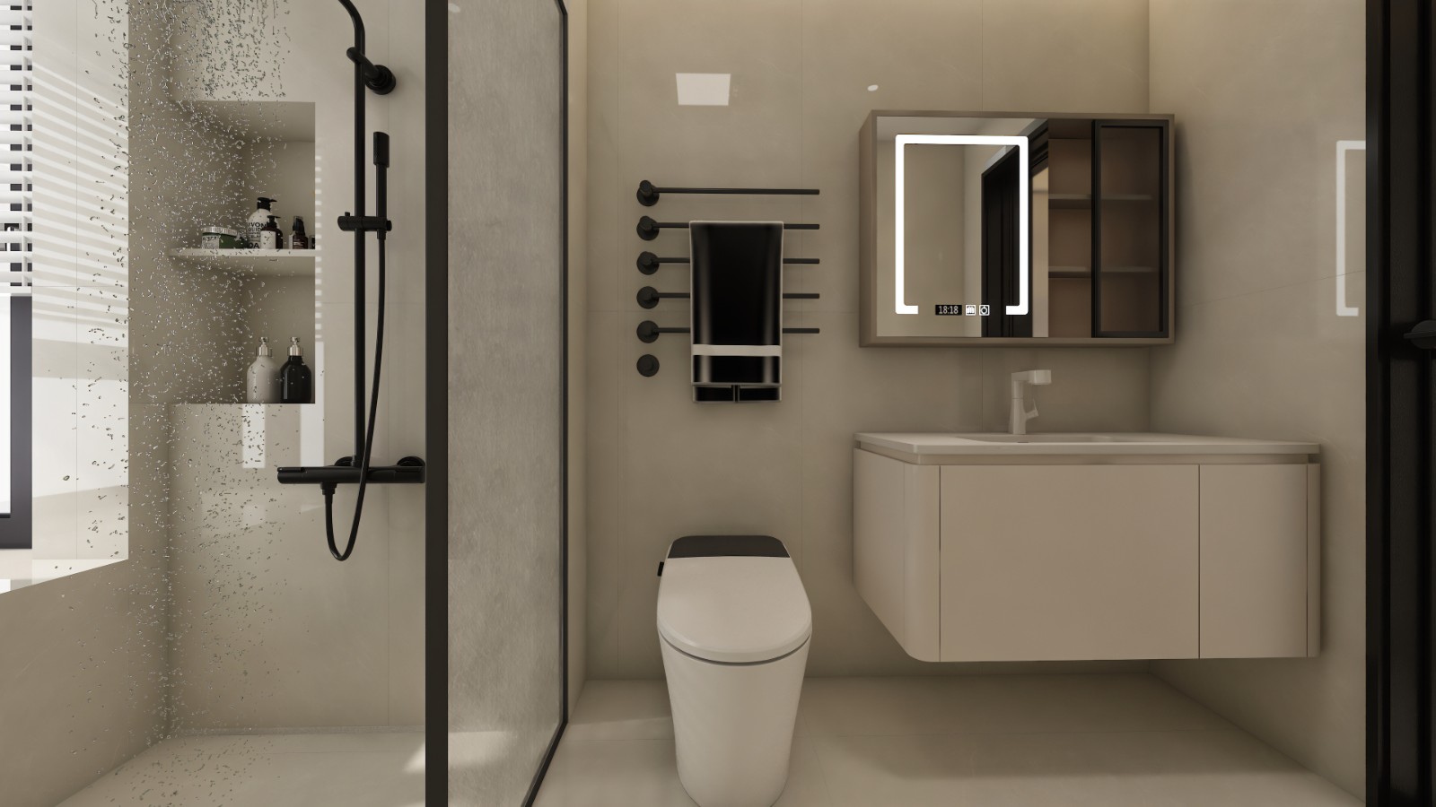 - 风格与色调:整体风格现代简约,以浅色调为主,搭配黑色五金件,形成简洁大气的视觉效果,同时与全屋的风格保持了较好的统一性。 - 布局设计:采用干湿分离的布局,淋浴区用玻璃隔断分隔,有效避免了水花外溅,保持了卫生间其他区域的干爽。空间功能分区明确,马桶、洗手台、淋浴区各有其位,使用起来方便高效。 - 设施与配置:配备了智能马桶,提升了使用的舒适度和便捷性。