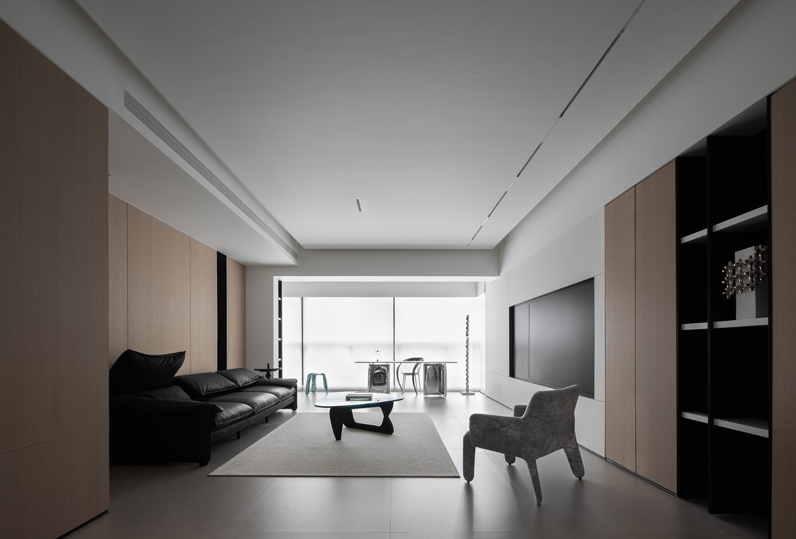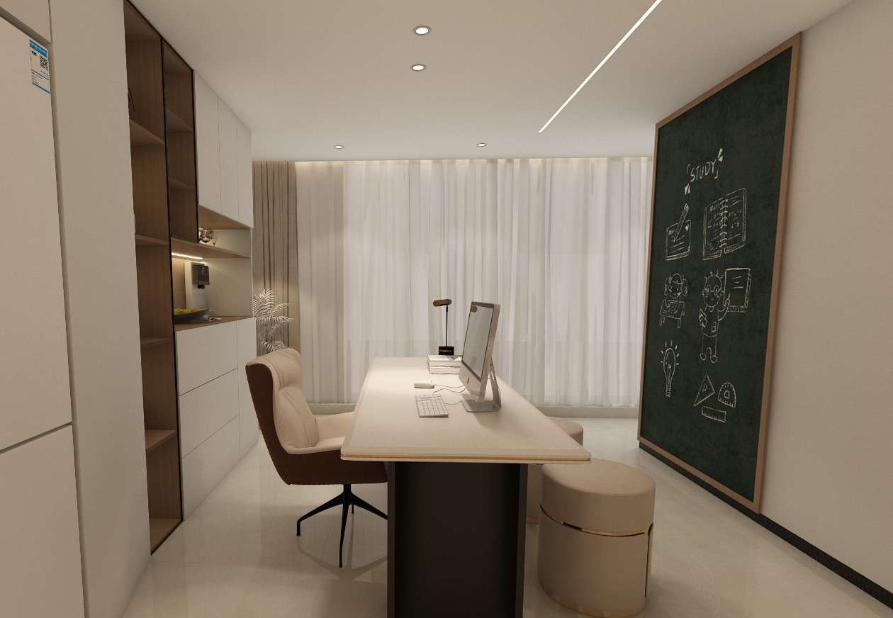 风格延续:延续了全屋的现代简约与温馨质感,以柔和的色调为主,搭配木质元素,营造出舒适且富有格调的学习、工作空间。 - 空间布局:布局规整且功能明确,书桌占据核心位置,旁边设置了舒适的座椅和小凳,满足阅读、办公等需求。一侧的储物区域设计合理,可用于收纳书籍、文具等物品,空间利用高效。 - 家具与装饰:书桌简洁大气,搭配同风格的座椅,质感十足。