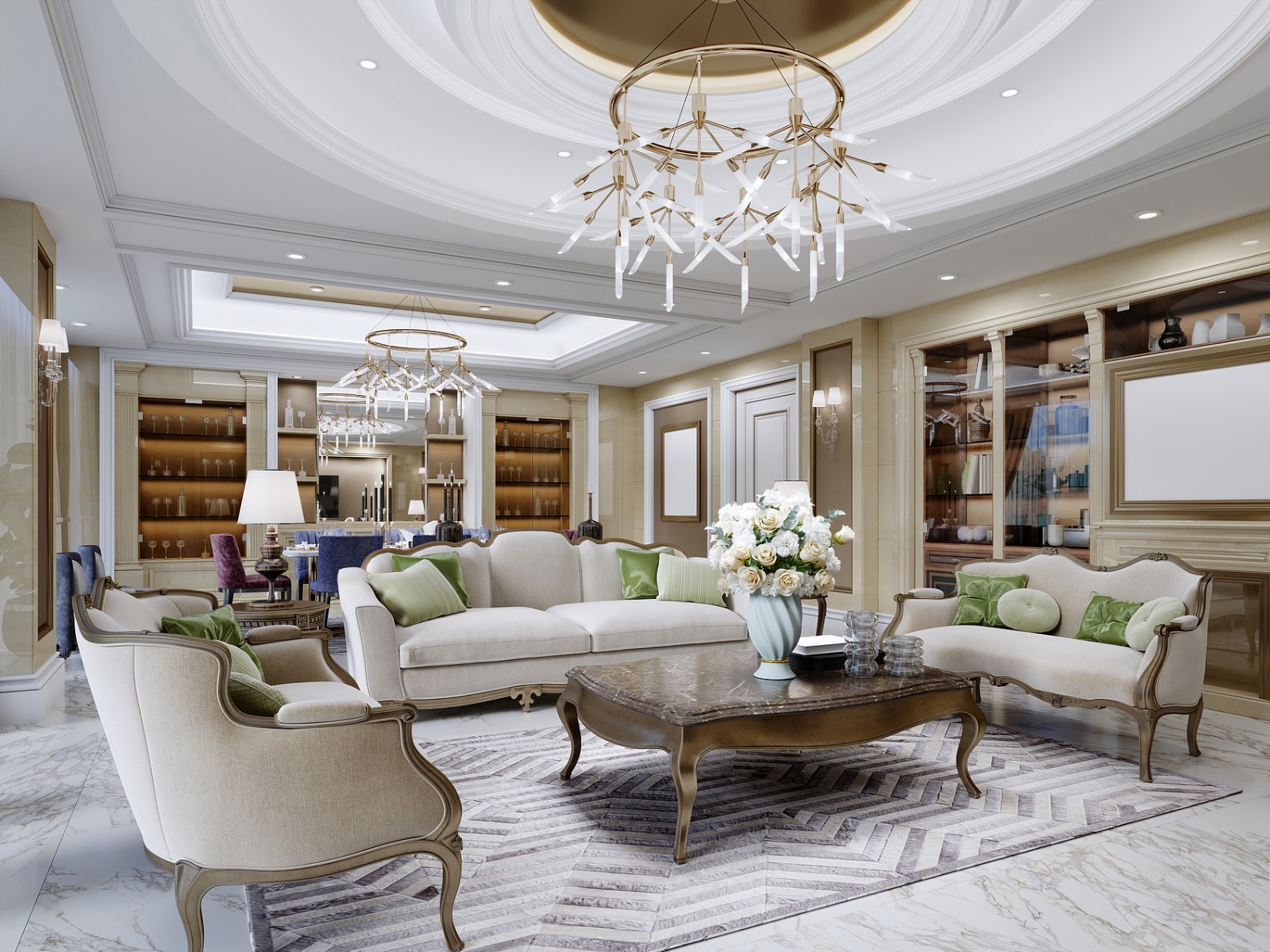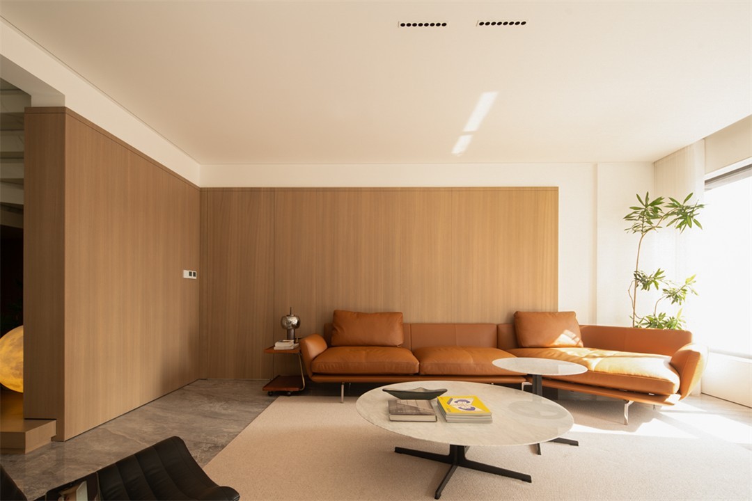 - 风格鲜明:属于典型的奶油风,以低饱和度的奶油色系为主色调,搭配柔和的灯光,营造出温馨、治愈的氛围。 - 空间布局:布局开阔通透,客厅区域与其他空间过渡自然,动线流畅。大面积的地毯增加了空间的柔软感,也起到了划分区域的作用。 - 家具搭配:选择了造型圆润的米色沙发,搭配同风格的椭圆形茶几,线条柔和,弱化了空间的硬朗感。沙发上的不同颜色抱枕起到了点缀作用,丰富了视觉层次。