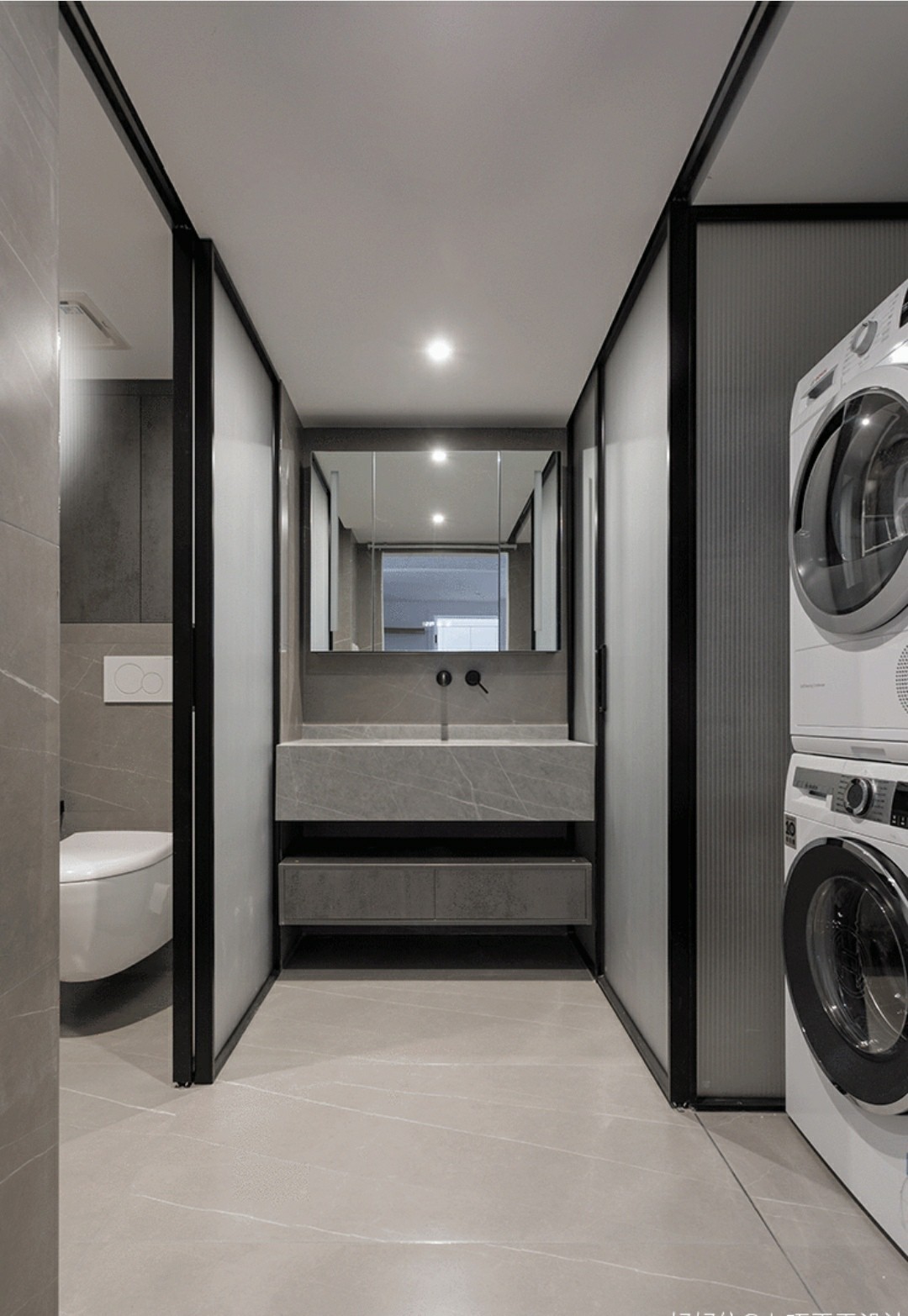 马桶间用了长虹玻璃推拉门。壁挂马桶简洁并且便于打扫卫生,水箱上面是收纳柜,同时马桶旁边增加了高压喷枪