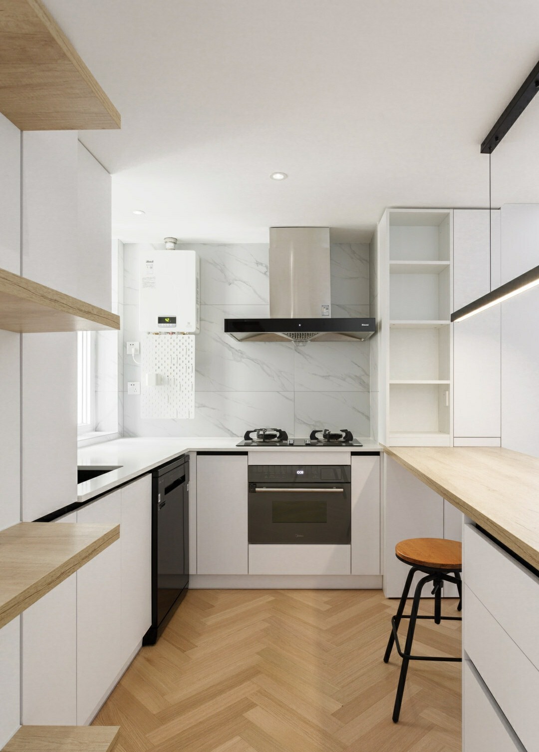厨房是用大面积的白色和点缀的黑色来进行搭配的,这样将烟机灶具以及电气可以很好的融入进去