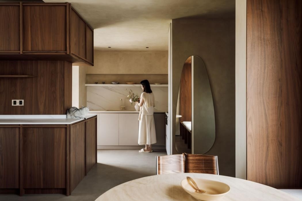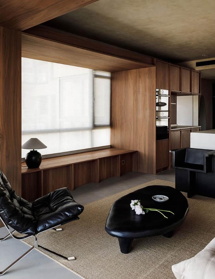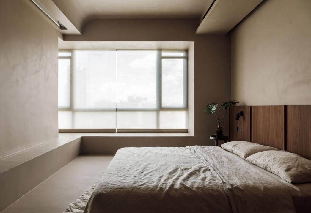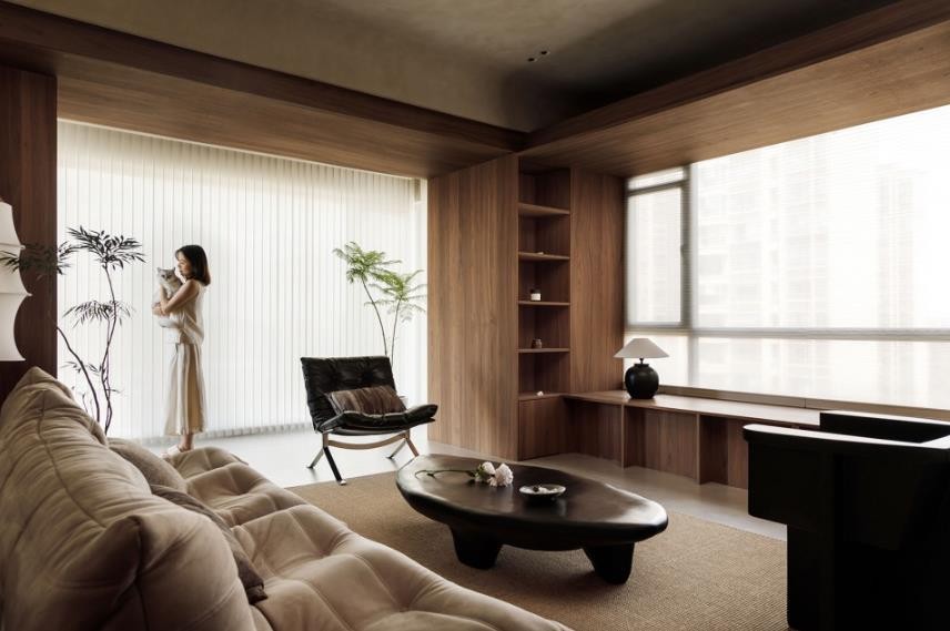 光线透过柔纱卷帘,被温润的木皮和涂料所中和,呈现出柔情的诗意。