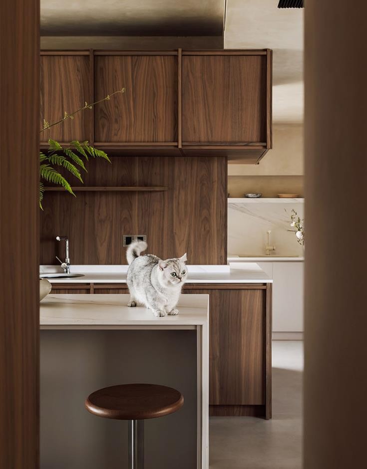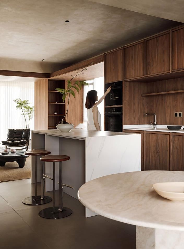 整个空间运用了极简的设计手法,隐去多余的装饰,材质选择了艺术涂料、微水泥,天然的胡桃木,凸显造型。