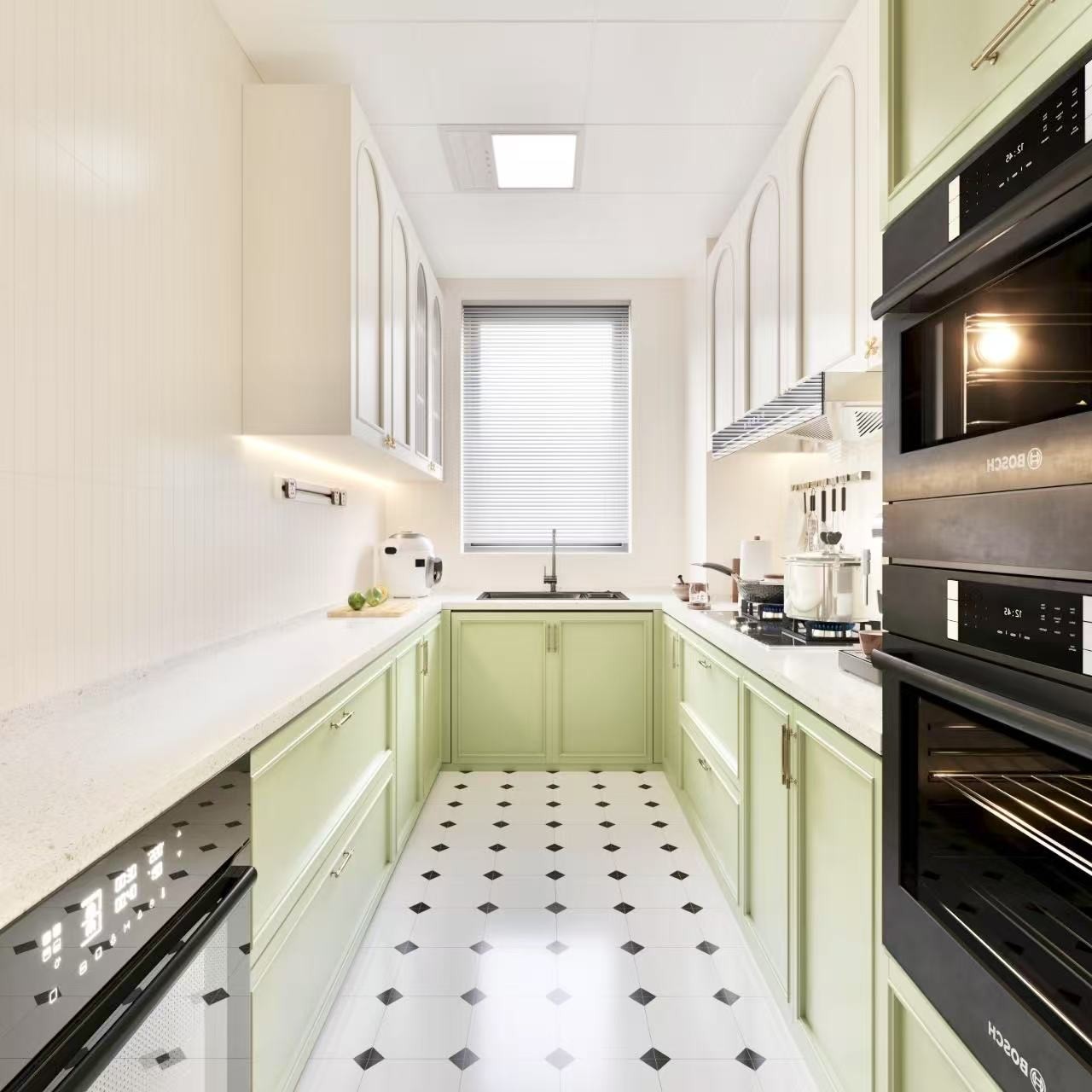 厨房采用了浅绿色为基调,营造出简洁、优雅且明亮的空间氛围,给人以清新、纯净的视觉感受。