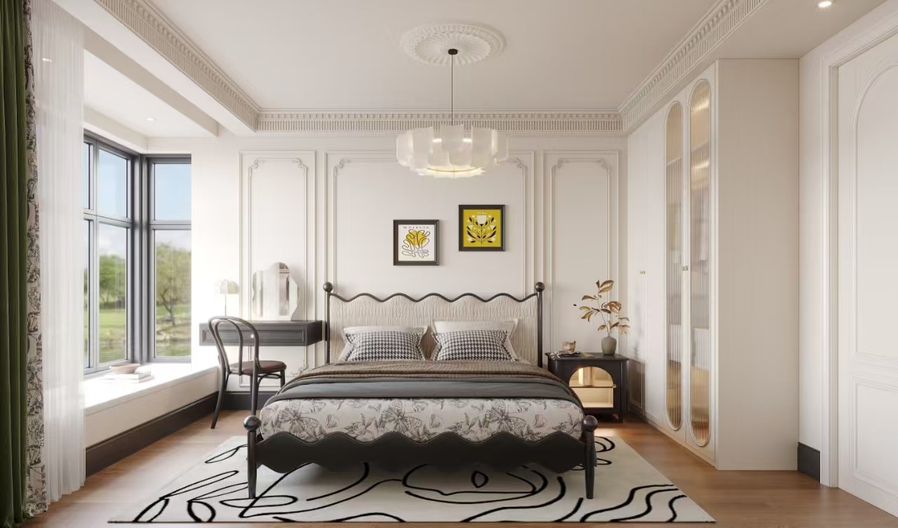 以柔和奶油风为背景,床头放置着简约的床头柜和装饰品,营造出温馨宁静的睡眠环境