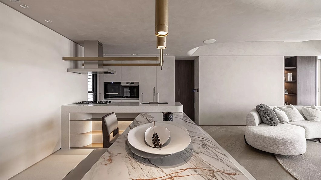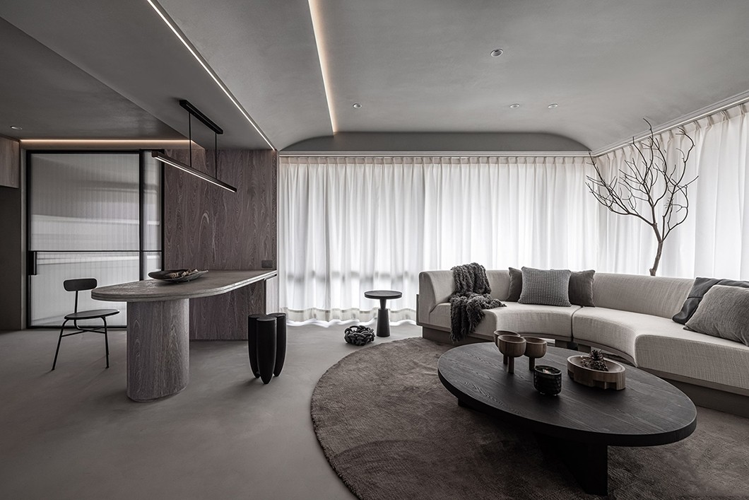 突显出弧型天花及线灯所相互交织的设计表现,让空间整体带来禅宗美学的感受。