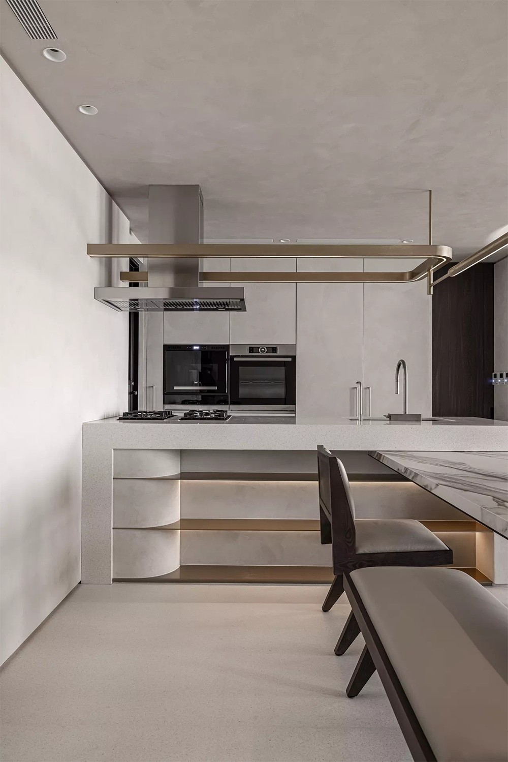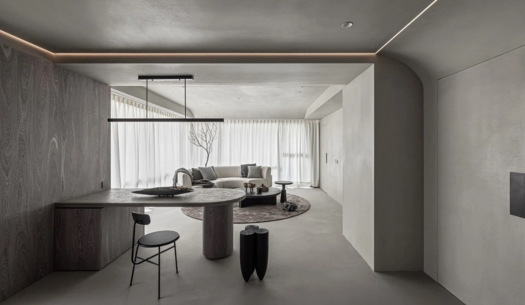 在这个追求“丰而不侈,约而不陋”的本真设计中,设计师力求通过一种纯粹的艺术构造与纯粹的肌理表达空间的平静祥和,寻找一种源于本真的飘渺空灵生活气息。
