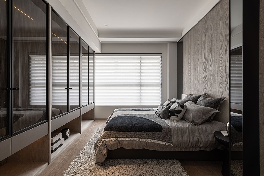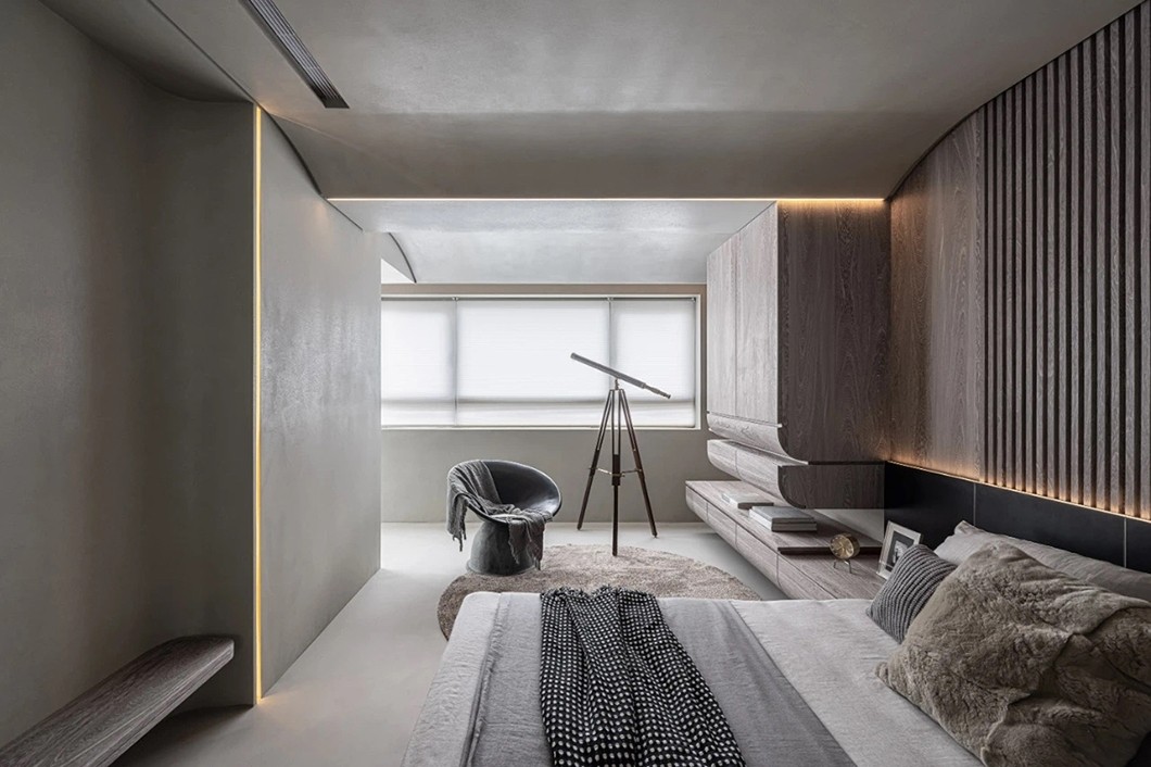 卧室的设计以简洁、柔软为基调,朴质的微水泥肌理泛起淡淡的优雅与宁静,白色的格栅窗,简洁明亮。
