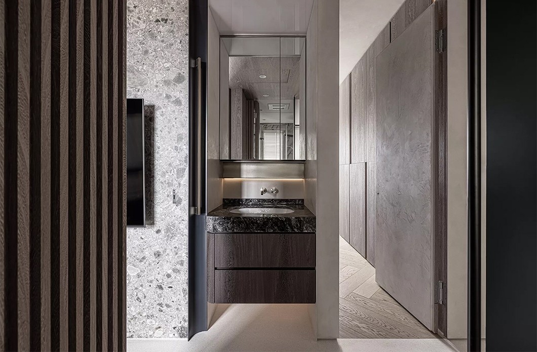 曲面柜体外观相做呼应,木纹纹理随着光线呈现深浅的光泽,增加空间的视觉层次。