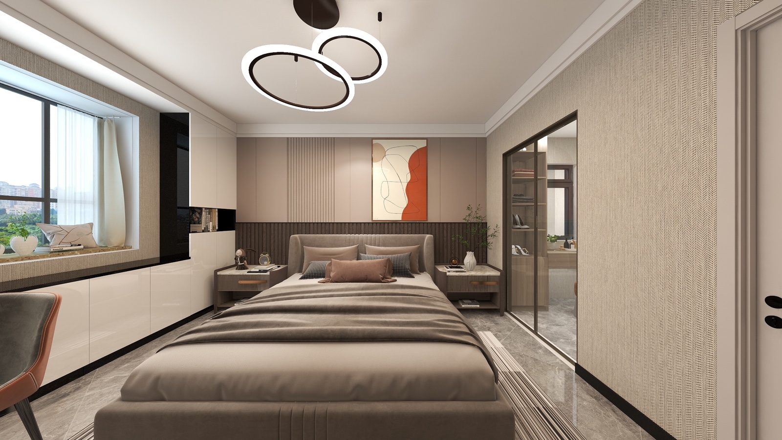 集成墙板颜色与床和壁纸颜色呼应,使卧室空间更加温馨。