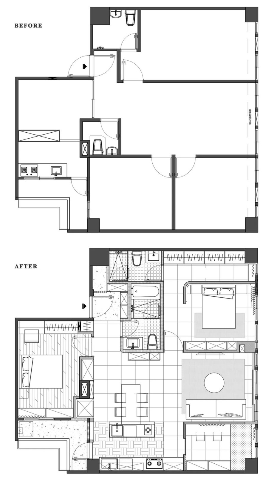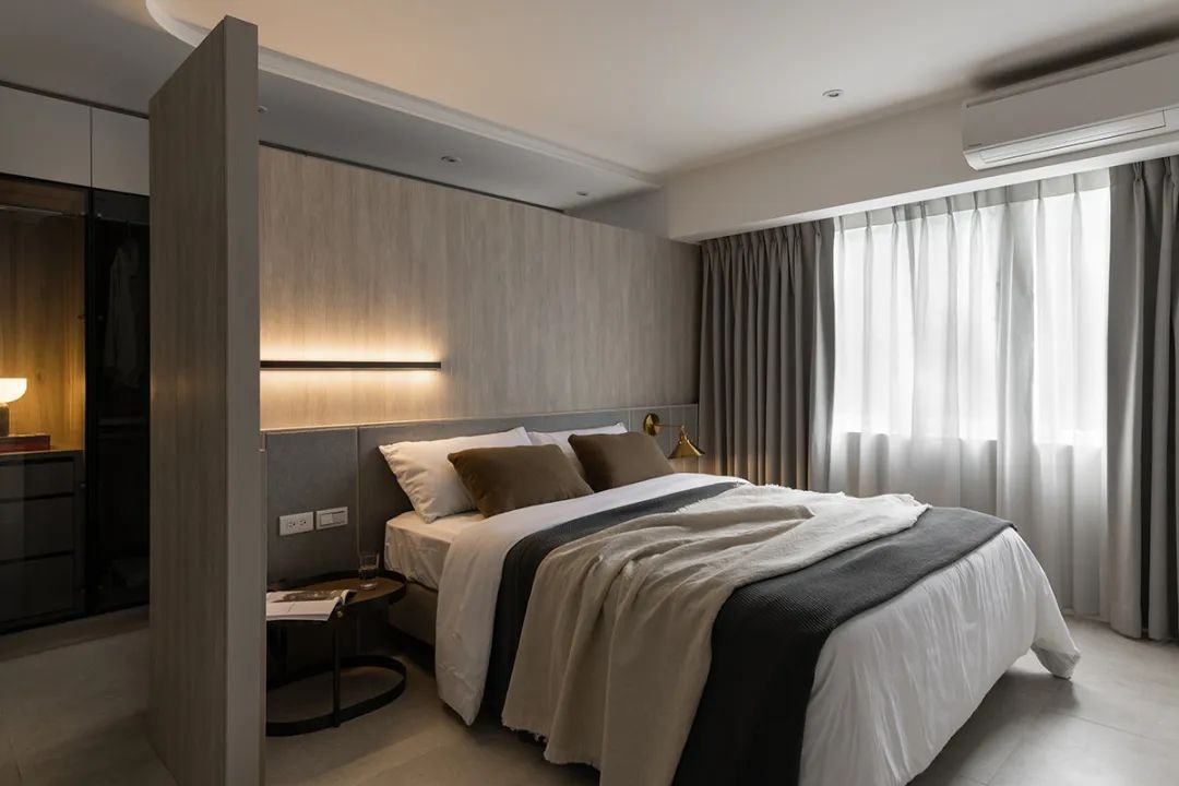 推开隐身在电视墙的隐藏门 映入的是专属夫妻俩的基地 别于过去狭长房型,如今卧房在挪移后 以方正轮廓实现更衣室规划 并落下一笔圆弧,形塑一道缓解公私之界的廊道