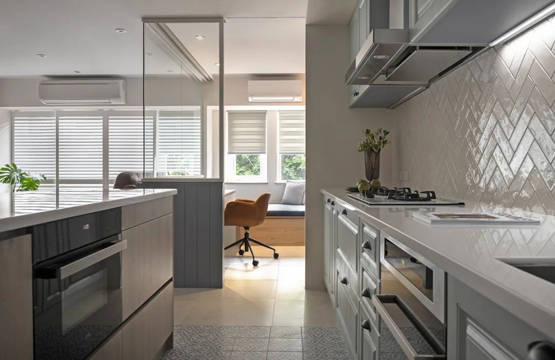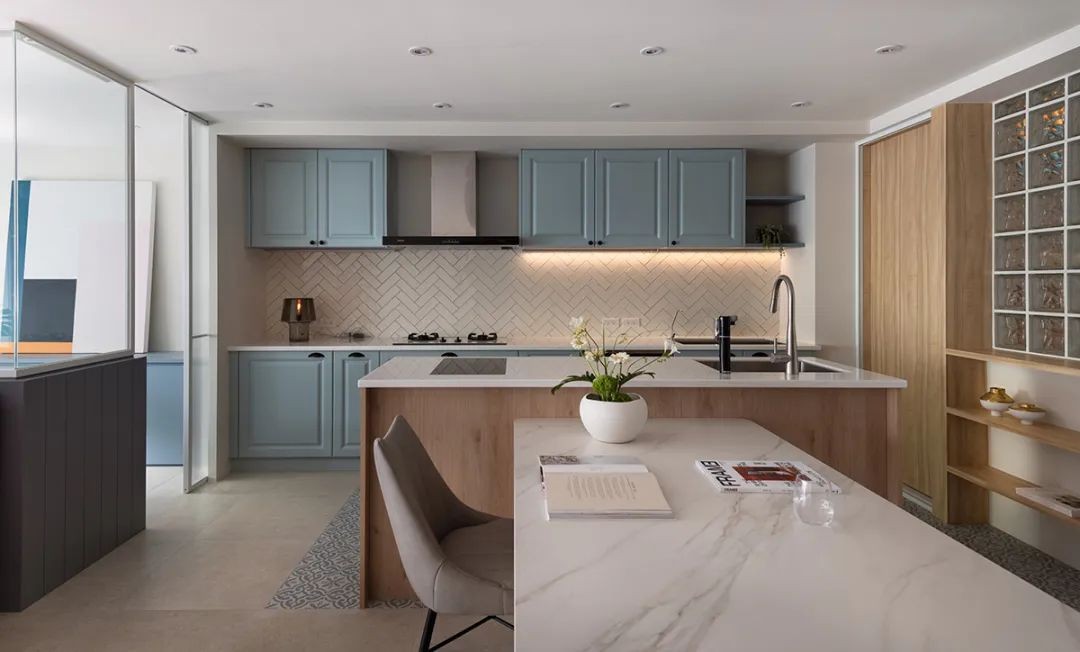 介在独立与封闭之间,书房即使僻静一隅 却拥揽了一室的动静即景 灰蓝色的半高矮墙以跳色之姿分隔着客厅与书房