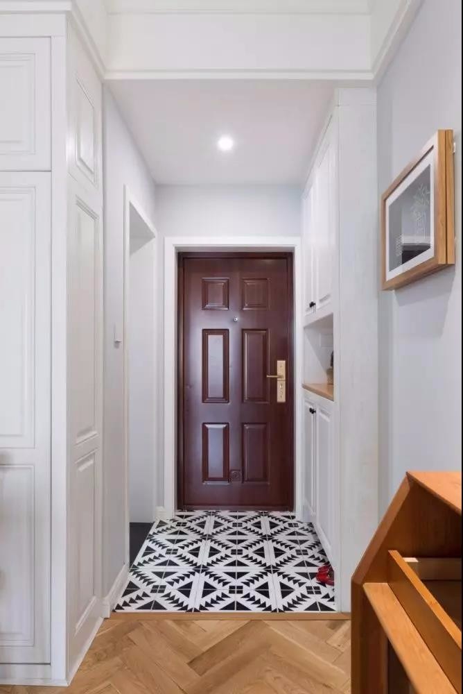 首先,入户玄关铺设了黑白小花砖,与客厅的木地板做了材质区分,让整个玄关更显独立,可以看到玄关设有嵌入式柜体,方便日常收纳。
