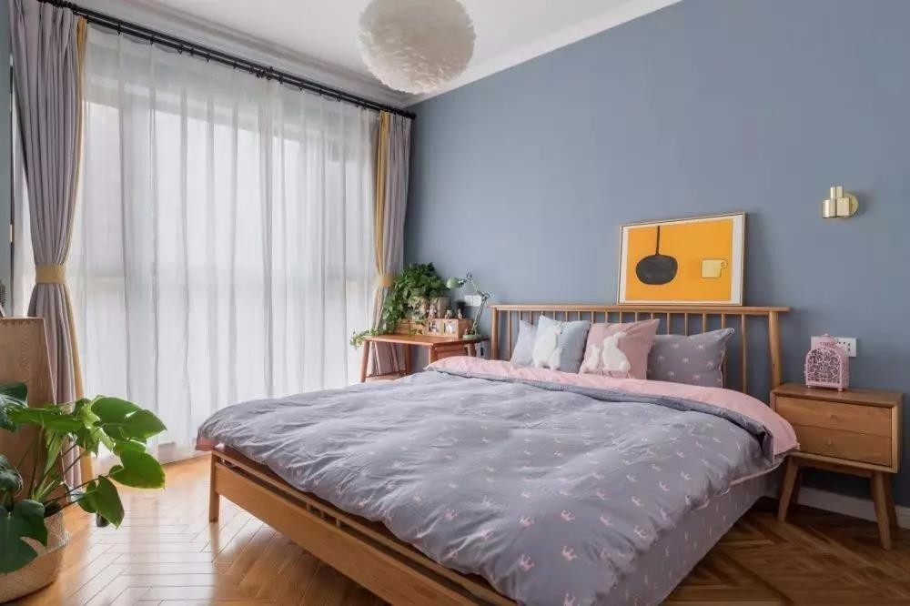 主卧以淡淡的灰蓝色为主基调,营造宁静而舒缓的居住氛围。床头柜也是原木材质,满足屋主原木控的心。