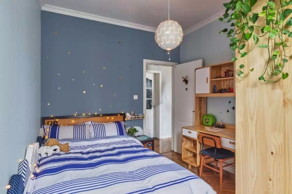 儿童房以蓝白色为基调,配以宜家网红吊灯以及梦幻的星星灯,充斥着自由灵动的气息。