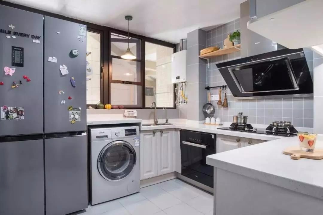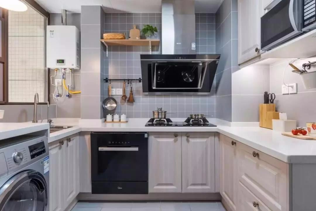 厨房在色彩搭配上,以灰白为主调,整体纯净而明朗,U型布局,大大提高厨房的实用性。