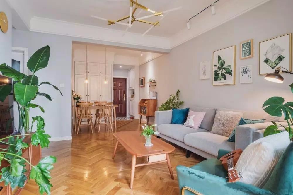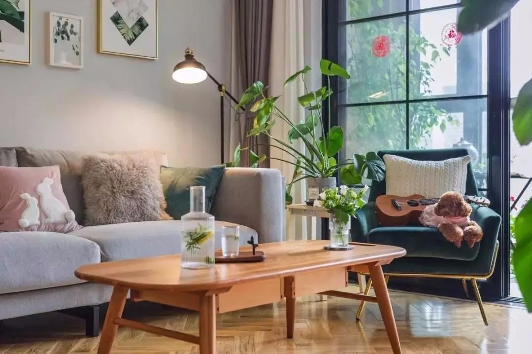 从阳台的角度望去,客厅每个角落都有绿植的点缀。