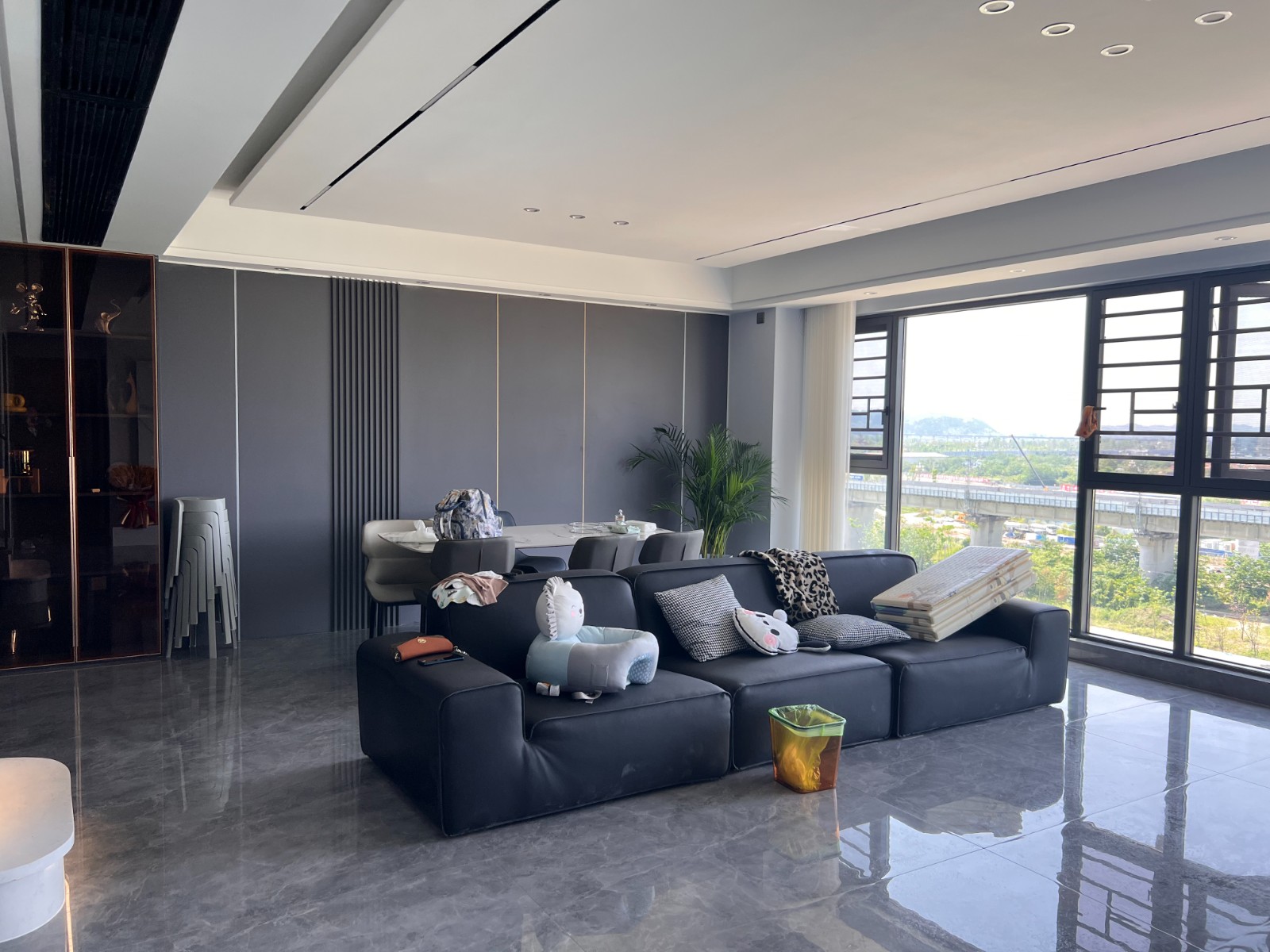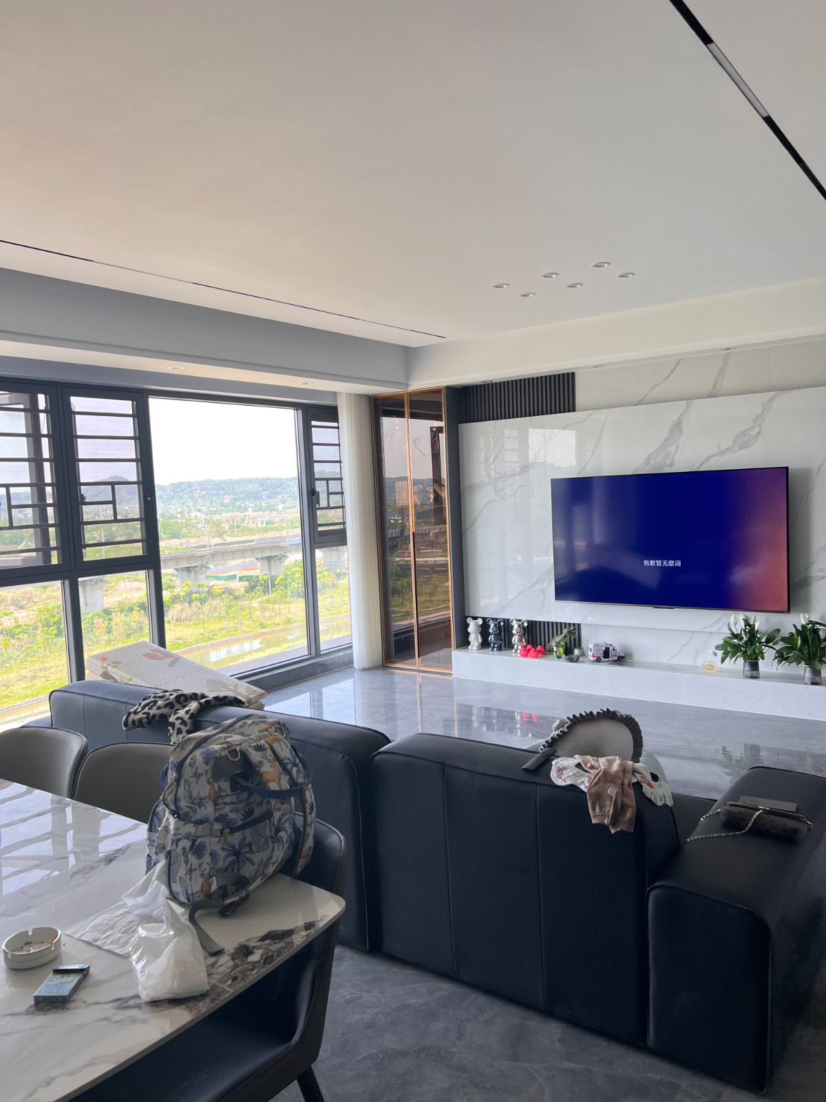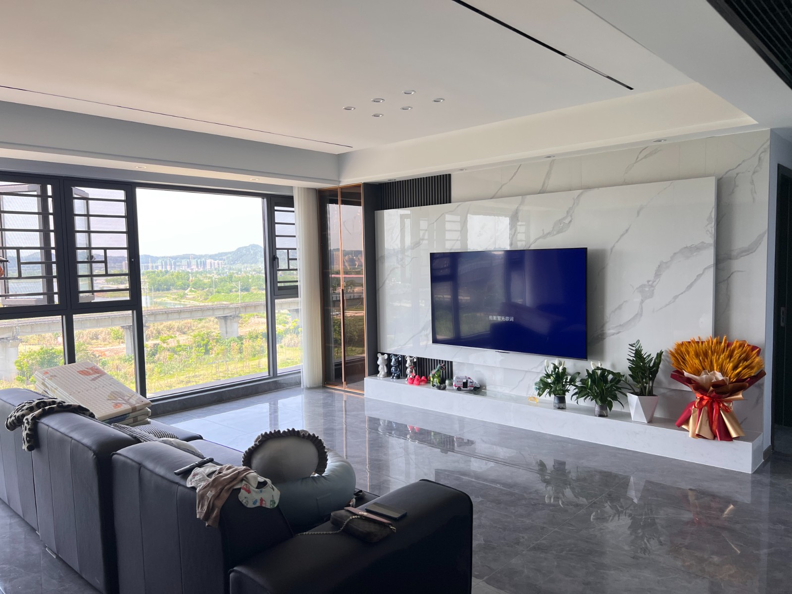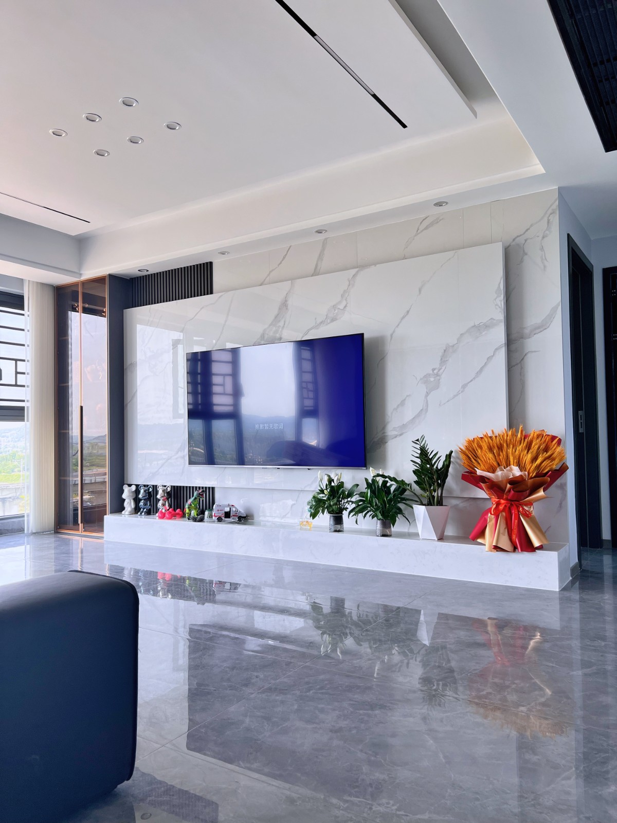 无主灯客厅设计,使用大面积的岩板和护墙板做装饰。