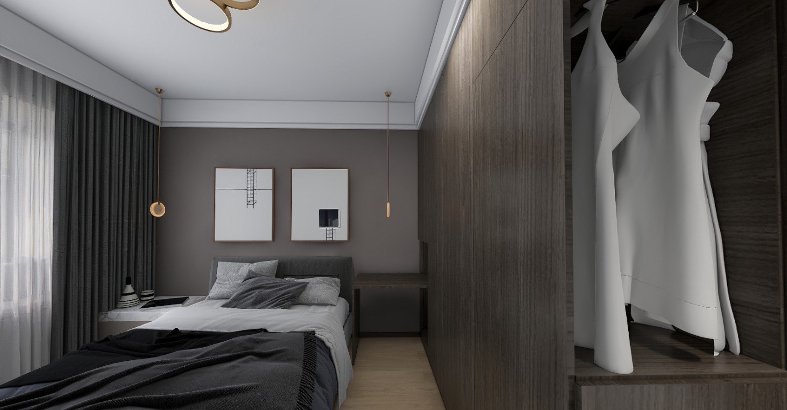 利用床头柜和衣柜的空间做梳妆台,衣柜侧面做开放式,方便挂外套等衣物。
