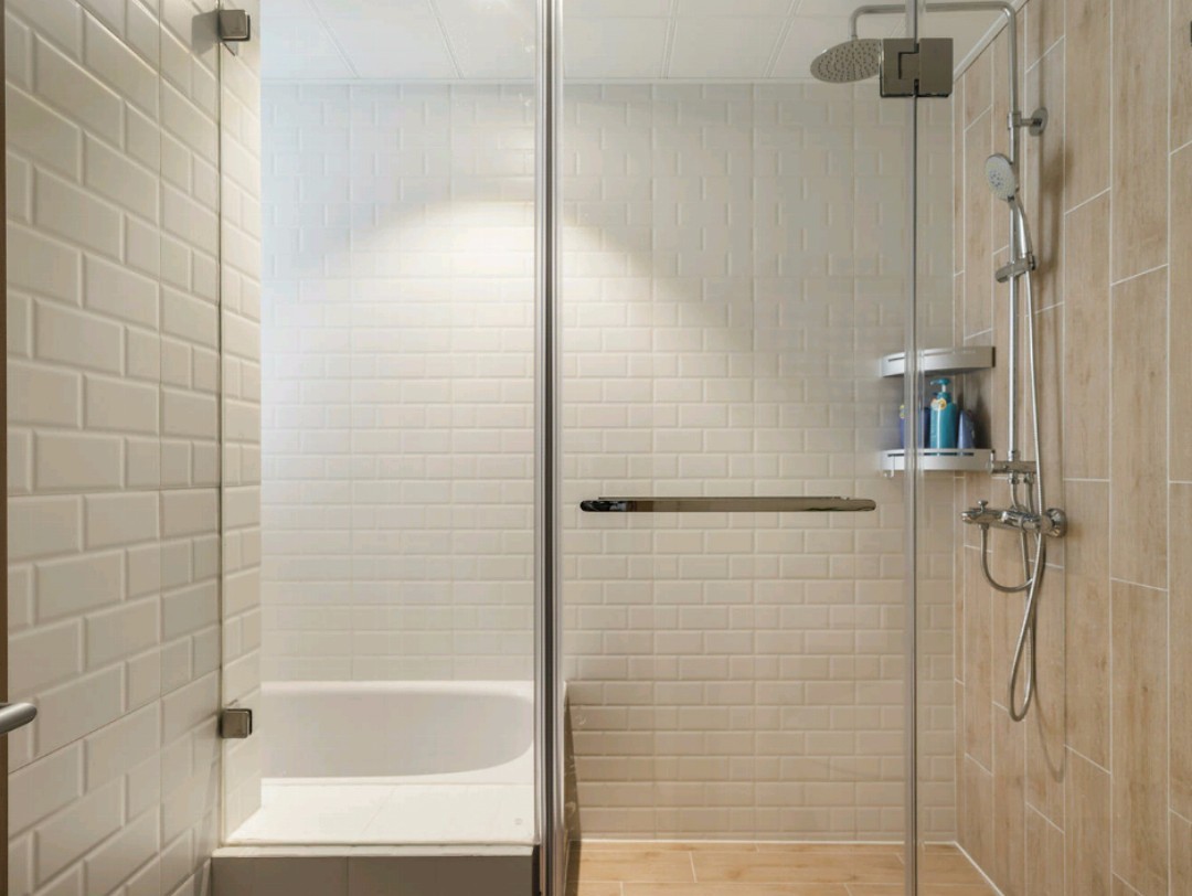 卫生间L型转角,淋浴房有浴缸和淋浴区。