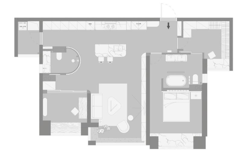 1.将厨房拉至中厅,餐厨一体。给本就无烹饪需求的业主一个宽敞,明亮方便沟通的空间; 2.将客房与公卫简化,使整体公共空间更加整体随性; 3.客厅倚靠承重墙做整面储物,将涂料覆盖至柜体可见面,力求空间的简约与干净; 4.在玄关处设置两扇隐门,一扇通往衣帽间,一扇通往卧室,并将卫生间打通,形成一个带有环形动线且具有隐私性的套房;