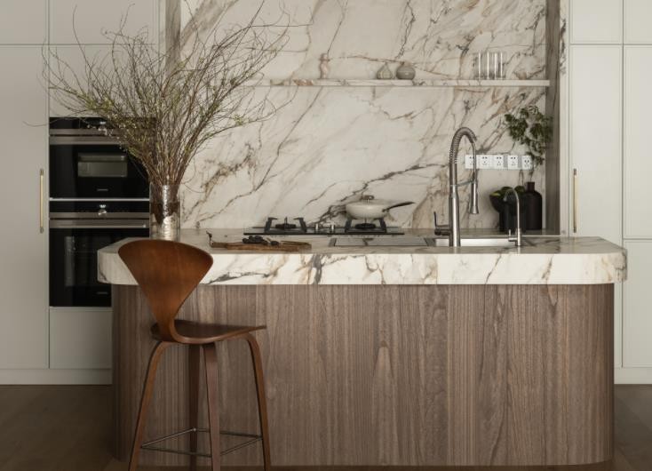 分解传统餐厨结构,使其以一个开放的形式并入公共空间。升降式的油烟机完全可以应付使用频率不高的烹饪需求,而在岛台可以完成就餐。简洁的餐厨区是这所房子的中心点,通往每个区域都会经过它。磨平岛台的棱角,整体空间多了一份丝滑