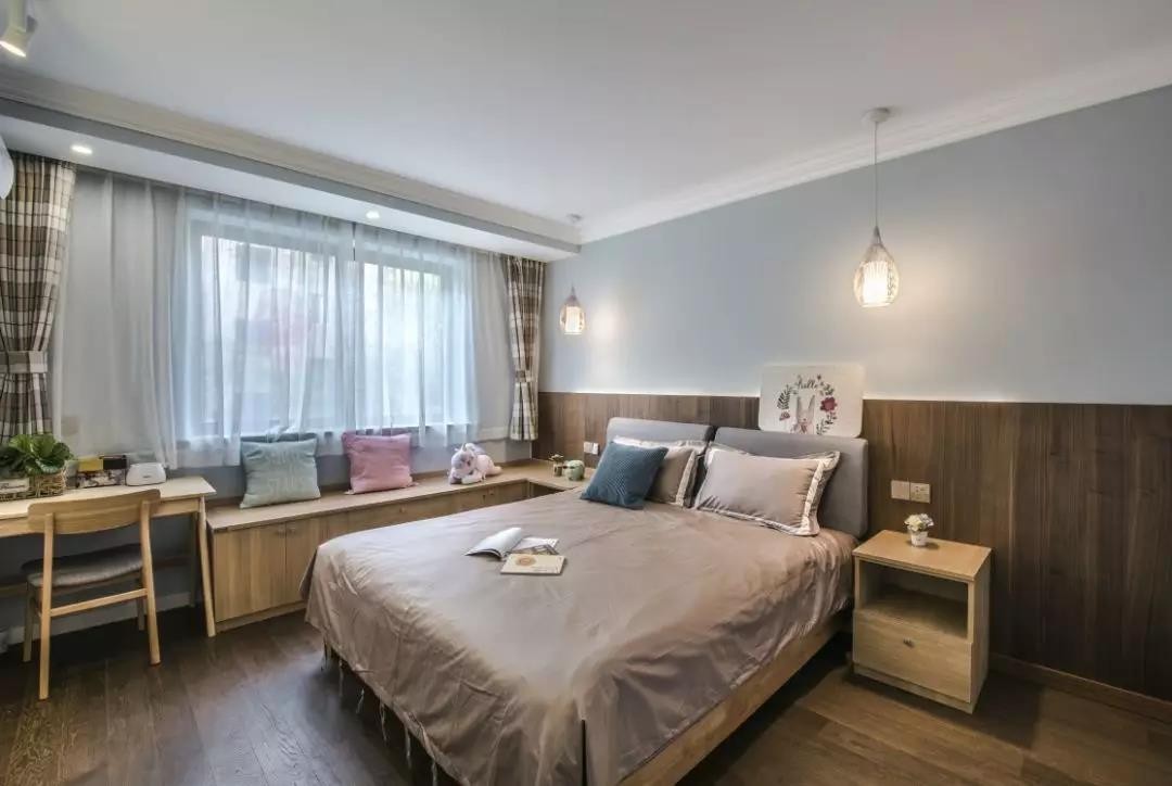 主卧墙面以浅灰色墙漆搭配木质墙裙,耐看又有质感。