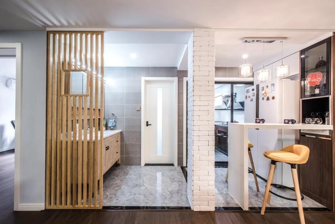 设计师将入户门改为外开式,不占用玄关空间,同时用高低鞋柜作为隔断,镂空的设计也不会阻断来自客厅的光源。