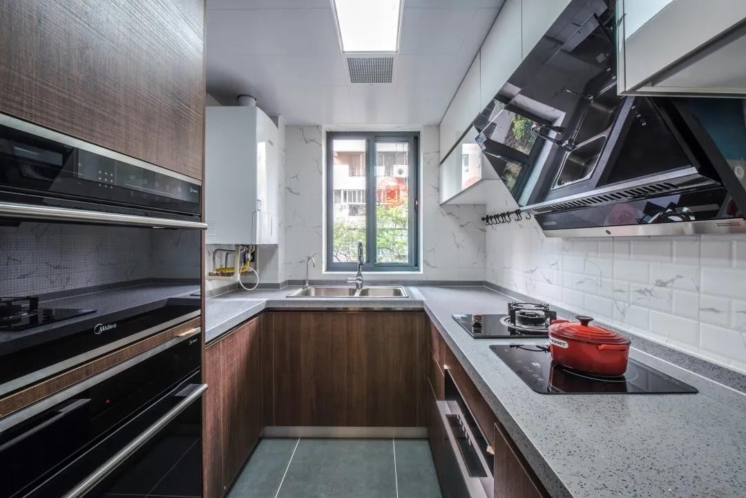 整个空间便不那么沉闷。别看吧台区域小,不仅有冰箱和收纳吊柜,还连接着酒柜,闲暇时小两口在吧台这小酌一杯,惬意得很!