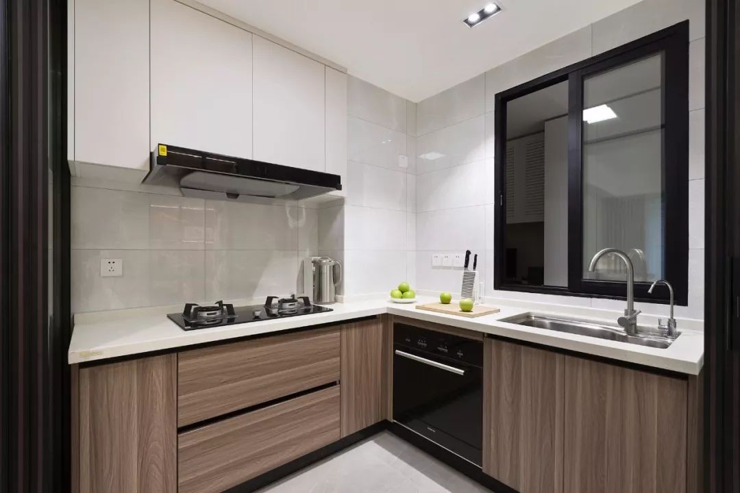 厨房的玻璃门是可以收起来的推拉门,做饭的时候把门给拉上,就不用担心油烟的问题了。L型的橱柜布局方案,让厨房显得紧凑又实用。