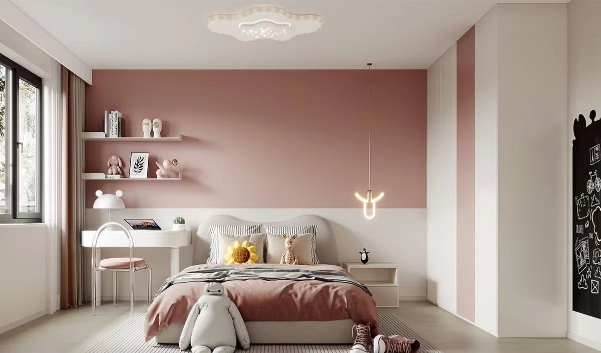 粉色与白色搭配占据卧室中***的面积使空间充满了甜美,童真的基调米黄色的地面与其他界面的家具浅色相比具有下沉感拉开了空间的高度