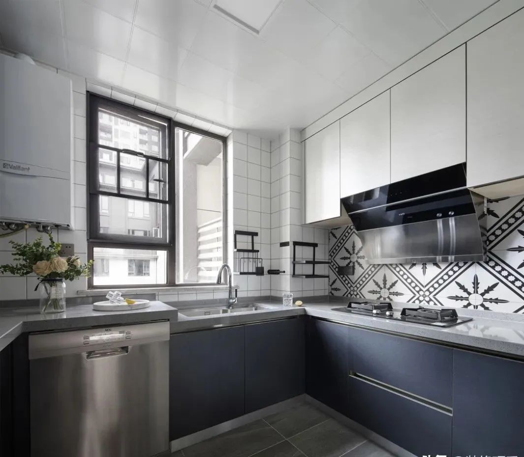 厨房虽然设计得很漂亮,但是不建议在灶台后面使用多纹路的仿古砖,因为仿古砖比较容易藏油污和灰尘,也比较难清理。