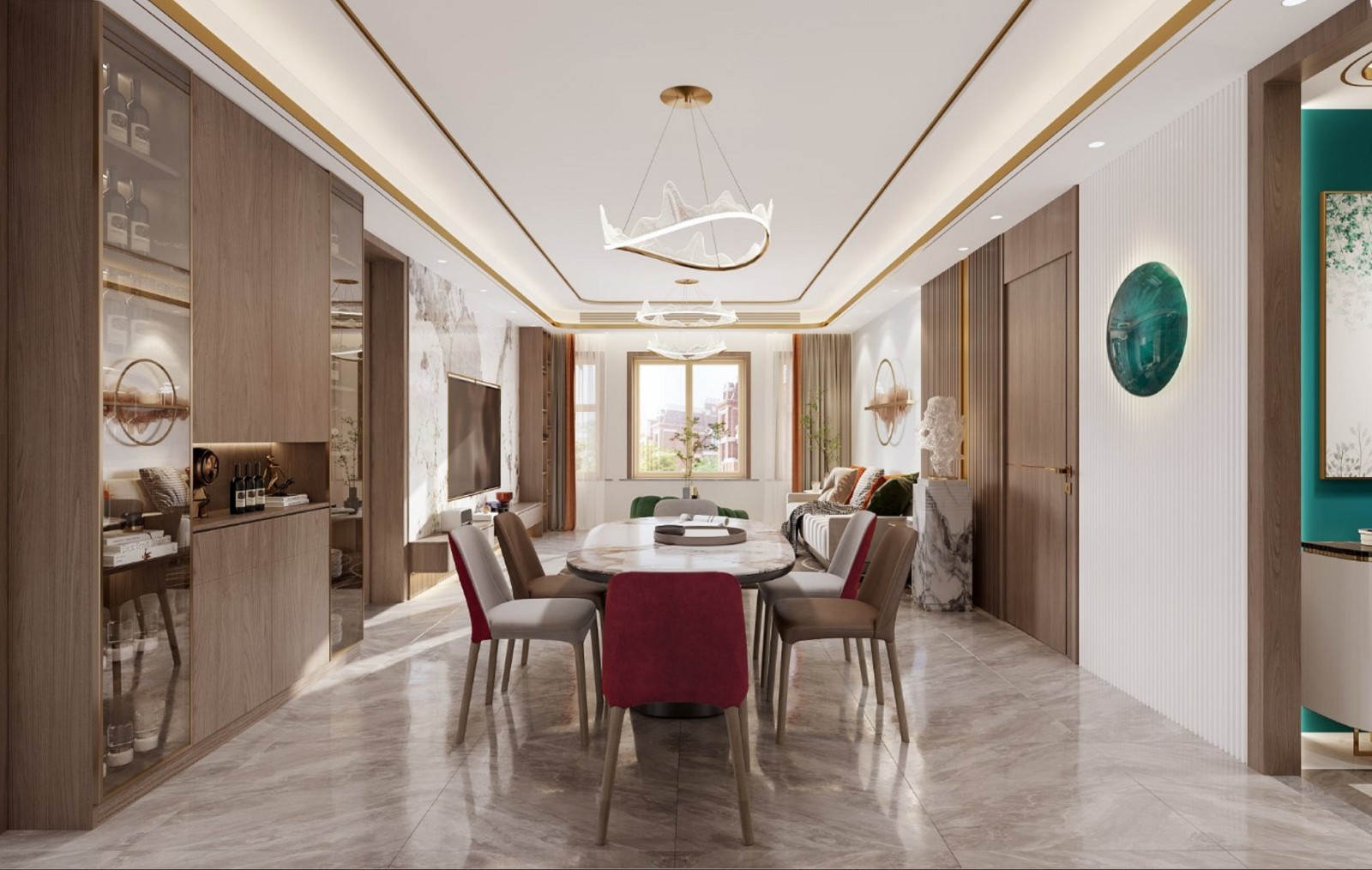 原木色调、橙金色的吊顶装饰条,使得整个空间充满自然气息跟***感。红,绿的座椅点缀色,能使房间不会沉闷、单调!
