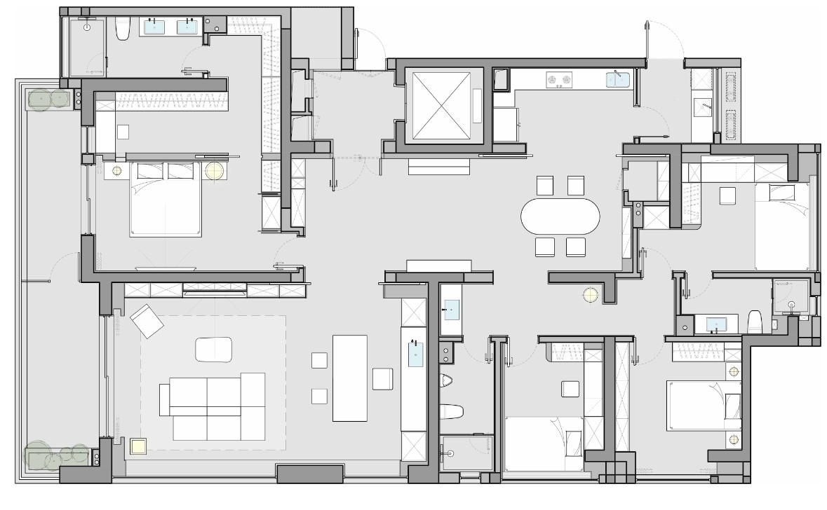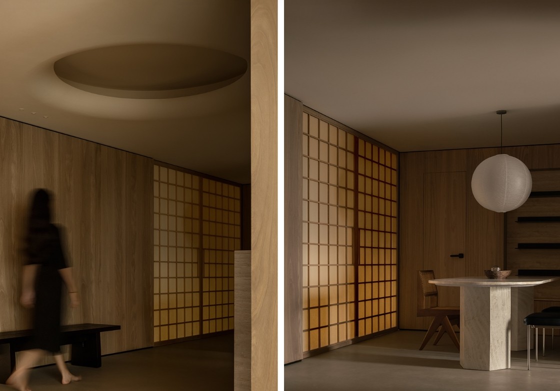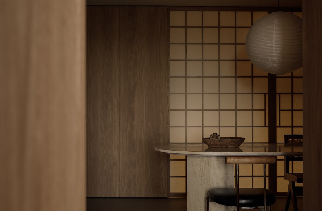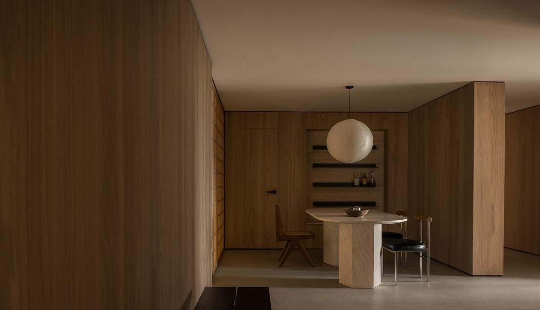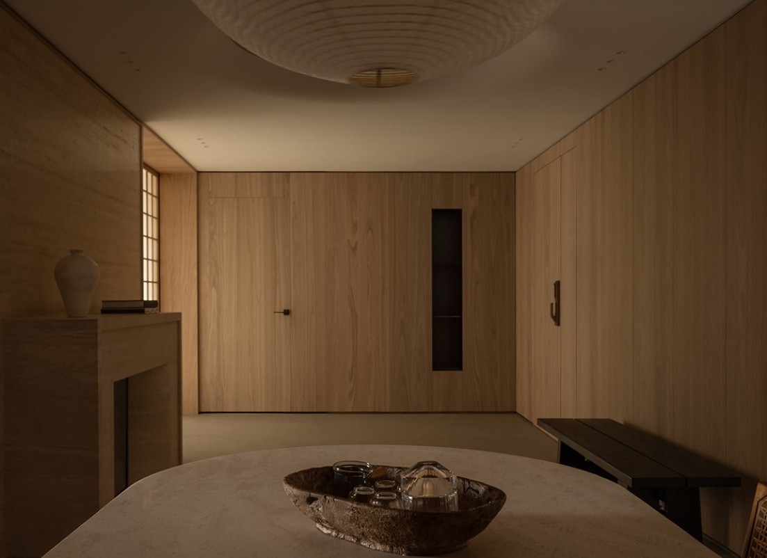 从玄关进入前厅,是一个聚合与流转区暗色木质条凳与浅色石纹壁炉形成与餐厅融合的第二玄关,新风与照明功能隐于天花圆顶之中,开合之间自由联通厨房、客厅、卧室。动静虚实,思深言浅,以至平和。