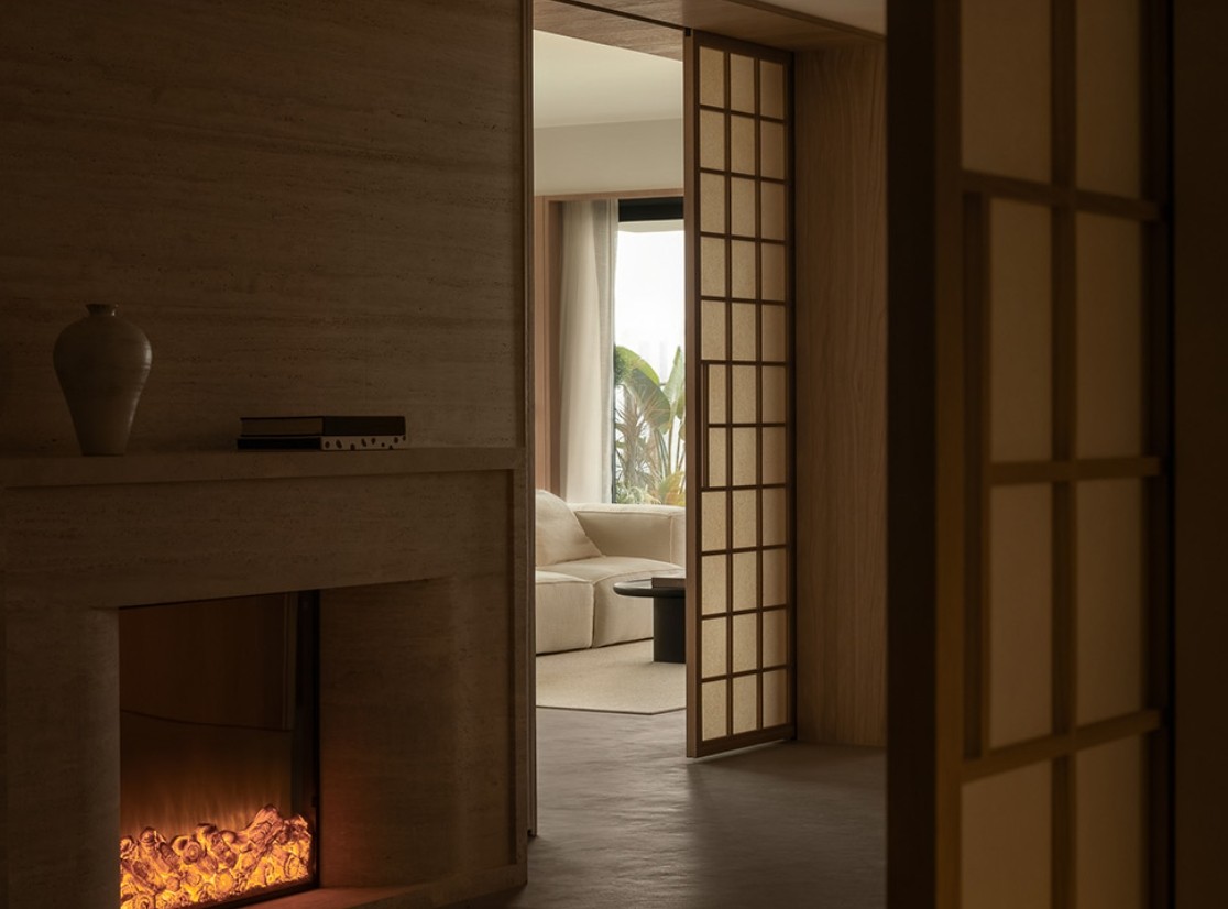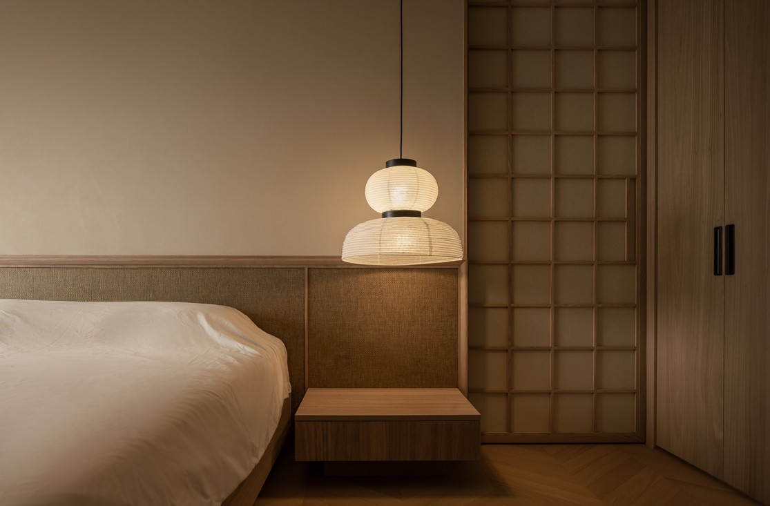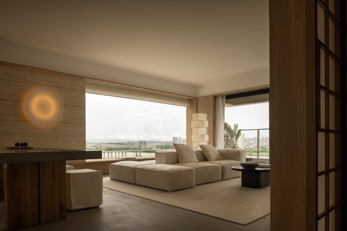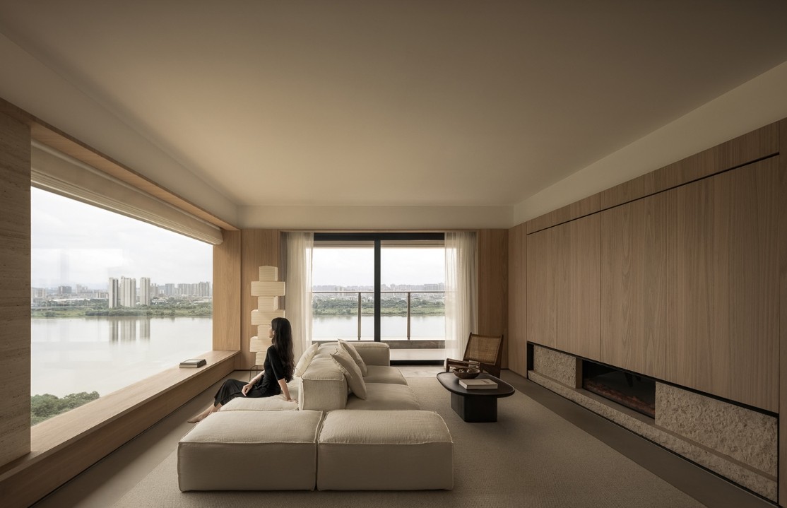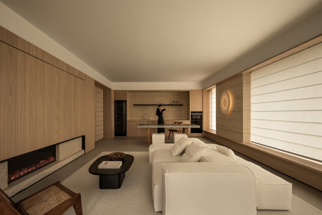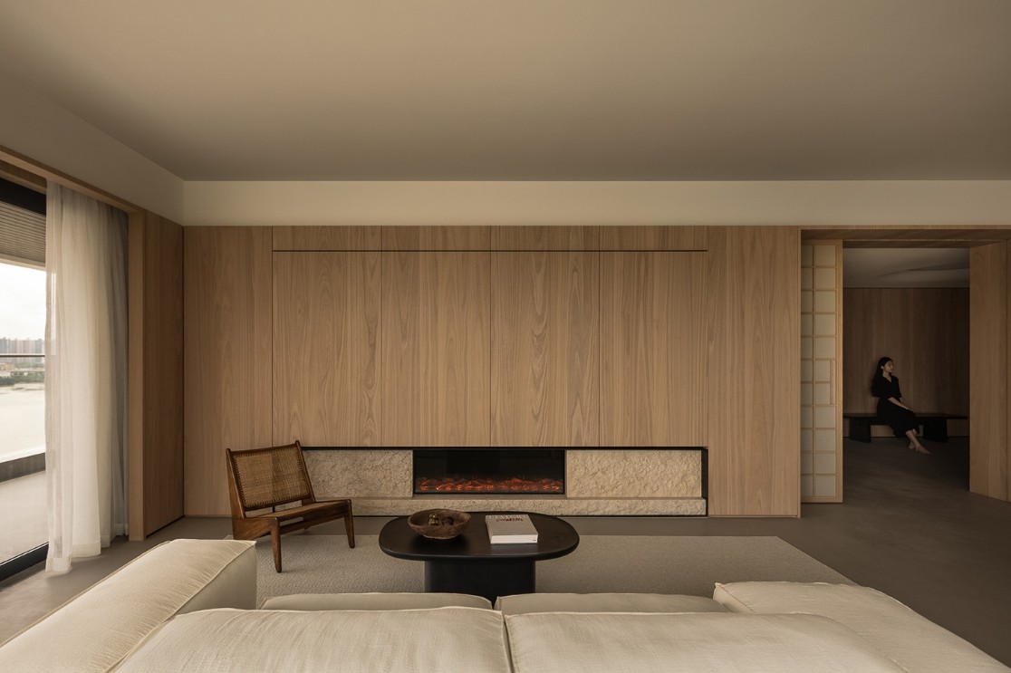 设计师选用双向布面沙发一组,配搭木几一方、木椅一张,临窗纸灯一盏,呼应柜体石间壁炉,宽厚而轻盈、质实而温和。