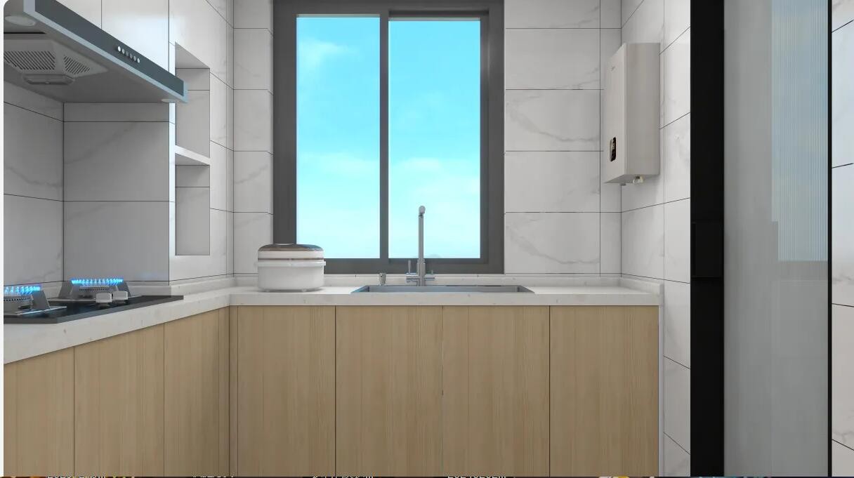 进入厨房,L型的橱柜设计简洁大方,木色橱面也充分营造了清新且文艺的生活氛围。而在合理规划空间布局的过程中,角落的嵌入格收纳可以用来摆放瓶瓶罐罐,为平时烹饪提供更多便利。