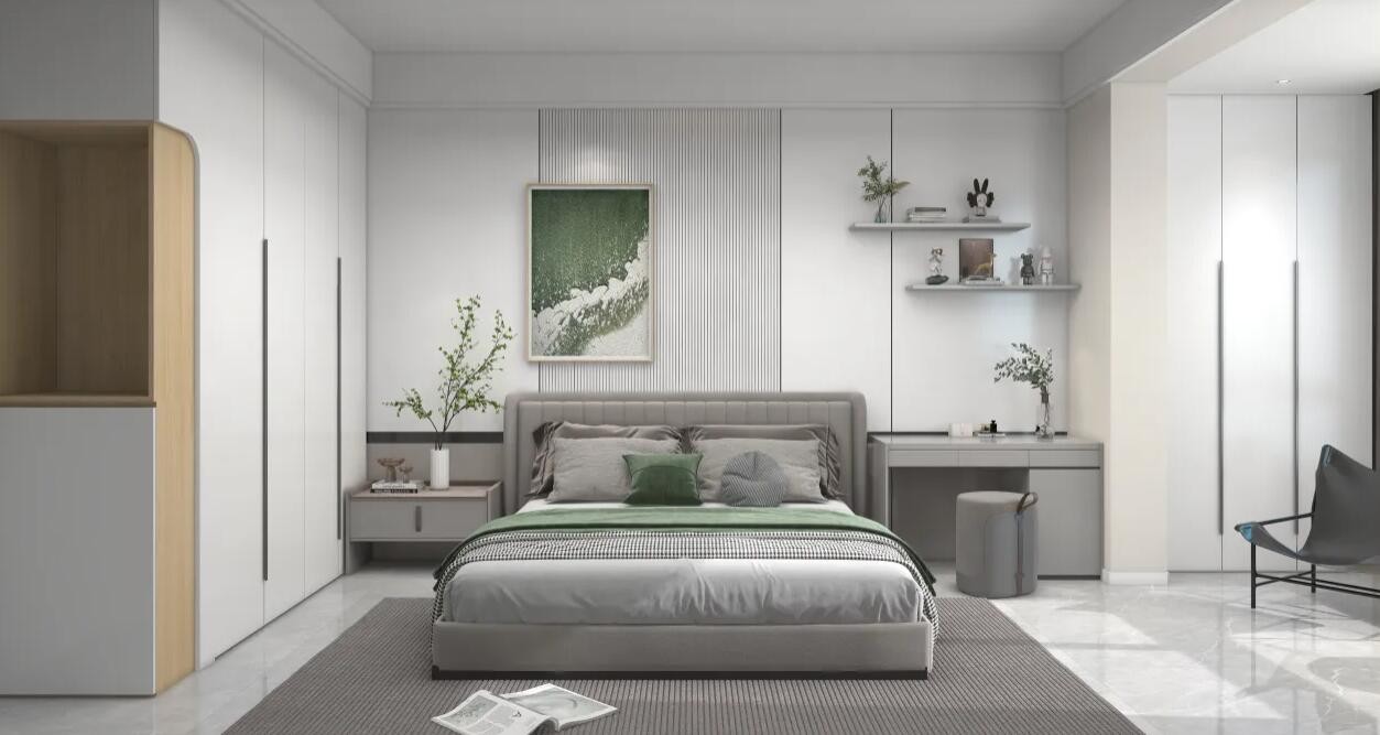 奶油白的恬静与墨绿的淡雅相互成就,在大面积的白色铺展之下,卧室中只是点缀几许绿,便如锦上添花般打造出怡人的休憩环境。 房间背景墙一角布置墙壁收纳,几本书籍、一株绿植,亦或手办玩偶的装点,丰富空间层次之余,也是生活治愈之所,勾勒出轻松且自在的氛围。