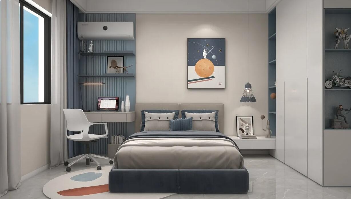 在蓝白演绎之下,男孩房多了几分酷帅。房间中干净利落的布局与童趣元素充分融合,搭配软包布艺床及定制悬空书桌与床头柜,几幅画饰再分散布置,点滴之间也为日常休息或是学习带来了舒适自在的体验。