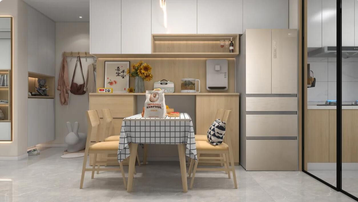 餐厅依旧是纯白+木色的定制设计,在满足日常实用功能的同时,也兼顾着美观与舒适。 实木边柜上搭配几株***又或文字装饰画、餐桌铺上格纹桌布等,一切清新文艺的元素相撞,让用餐时分也充满小小仪式感。